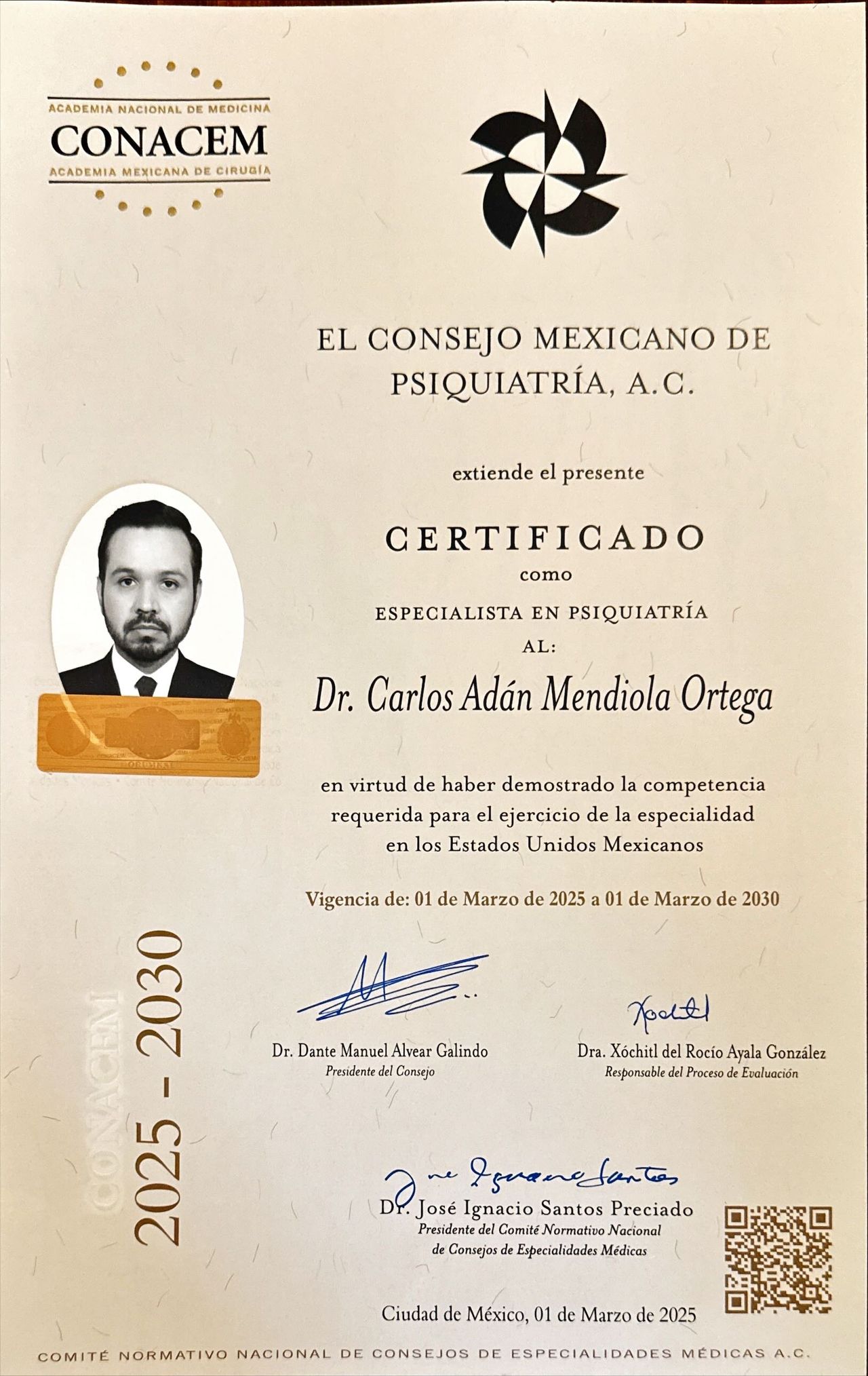 Médico especialista en Psiquiatría egresado del Tecnológico de Monterrey Certificado por el Consejo Mexicano de Psiquiatría Formación en Terapia Cognitivo Conductual (TCC) en el Beck Institute Maestría en Psicoterapia Dinámica por la Universidad La Salle
