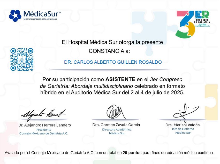 Soy especialista en adultos mayores (Geriatría); certificado por el Consejo Nacional de Geriatría A.C., con alta especialidad en Cardiología Geriátrica, con prioridad en la prevención de complicaciones de enfermedades crónico-degenerativas (diabetes mellitus, hipertensión arterial, demencia, Infarto al miocardio, enfermedad vascular cerebral, Insuficiencia cardiaca, fibrilación auricular, enfermedad renal crónica, osteoartrosis, fragilidad, sarcopenia, depresión).
