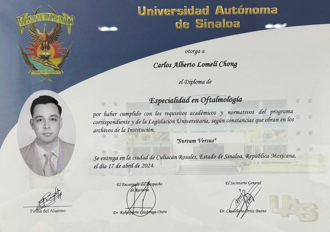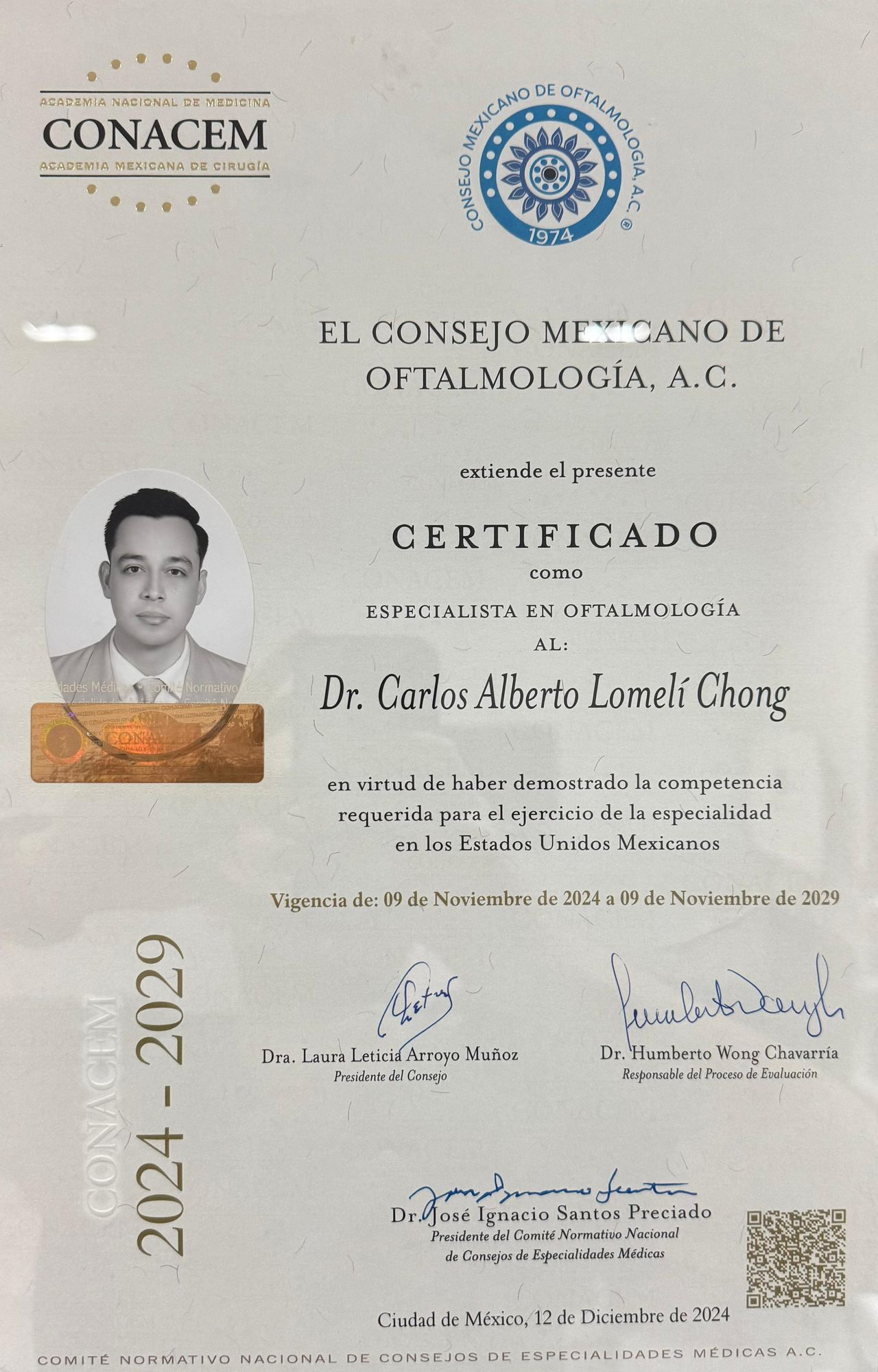 Estoy certificado por el Consejo Mexicano de Oftalmología, lo que respalda mi compromiso con la excelencia y la actualización continua en mi práctica profesional.