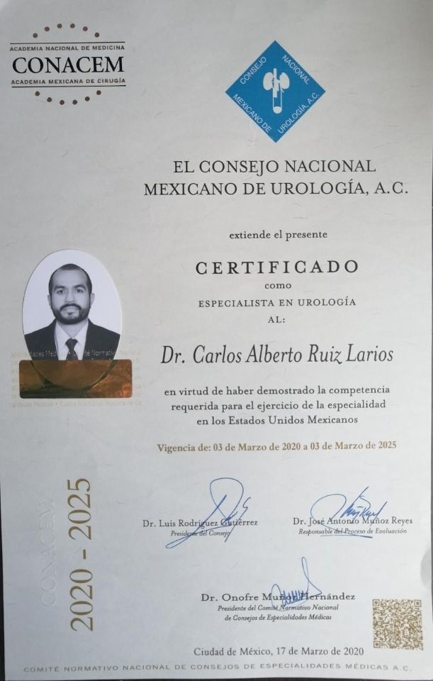 Hola soy el Dr. Carlos Alberto Ruiz Larios, Urólogo en la Ciudad de Cancún, Quintana Roo, Certificado y Recertificado por el Consejo Nacional Mexicano de Urología.