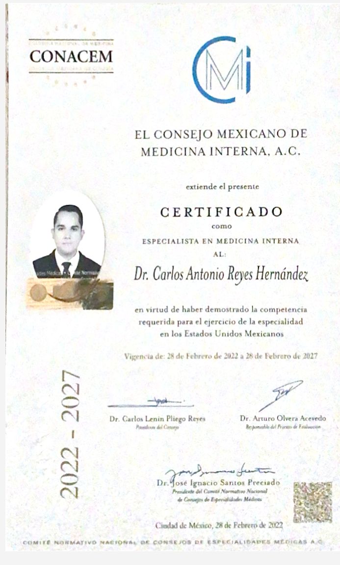 Soy el Dr. Carlos Antonio Reyes Hernandez, con especialidad en medicina interna y sub especialidad en infectología.