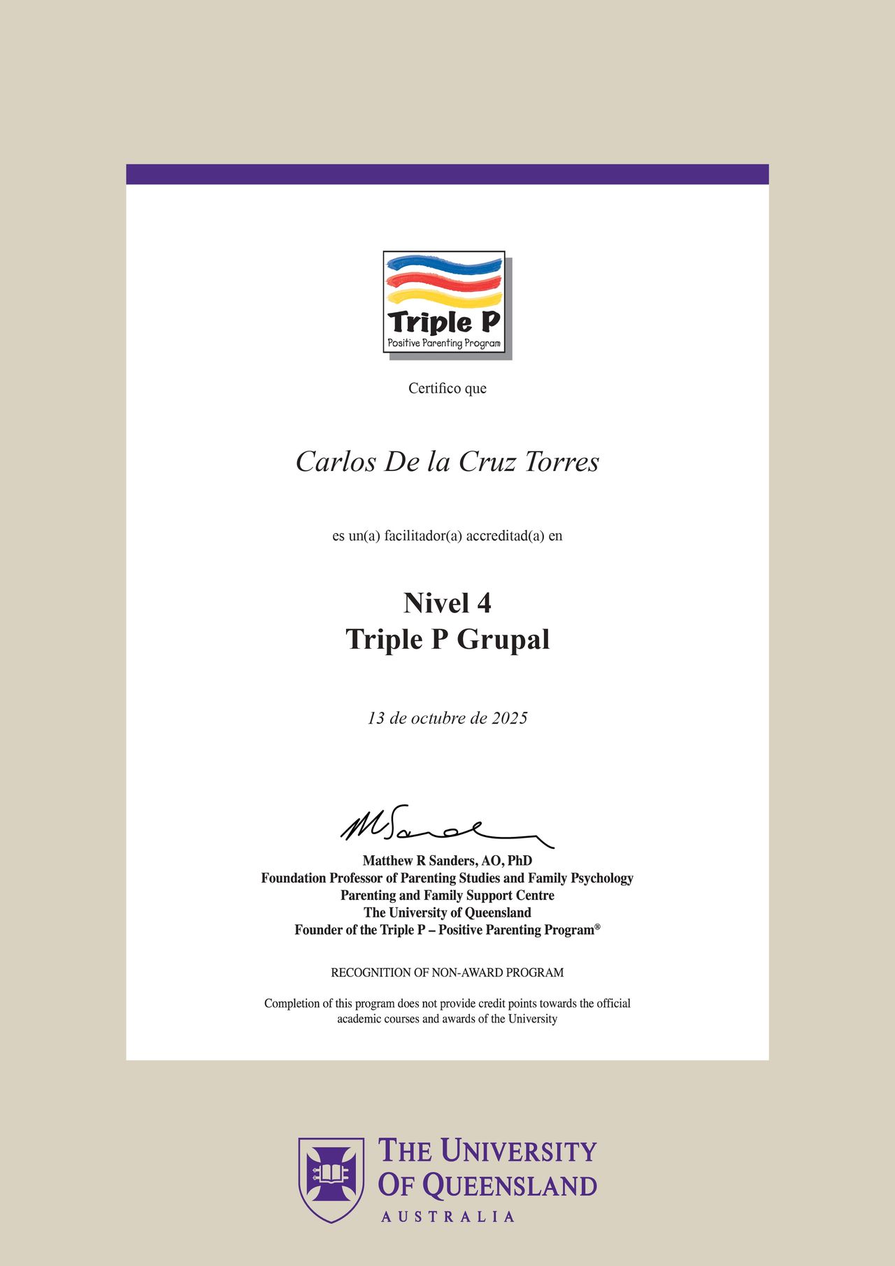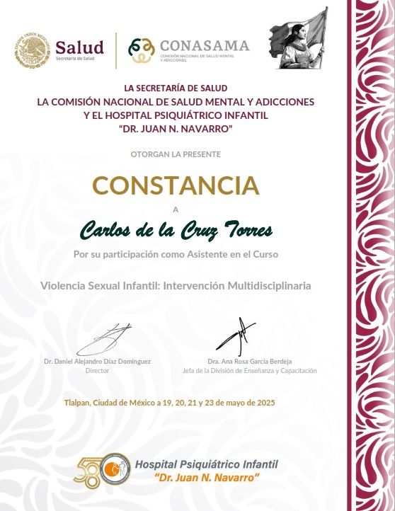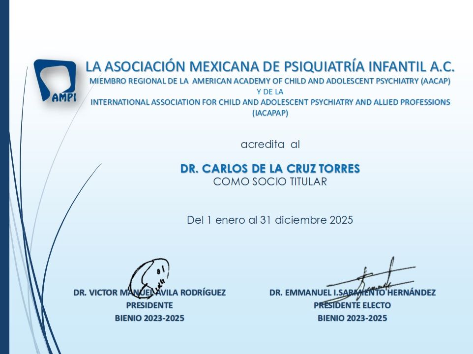 Mi nombre es Carlos De la Cruz, médico psiquiatra, con subespecialidad en psiquiatría infantil y de la adolescencia (también conocido como paidopsiquiatría), es decir, me especializo en la atención de problemas en salud mental de niños, adolescentes y adultos, así como sus familias, desde un enfoque del neurodesarrollo.