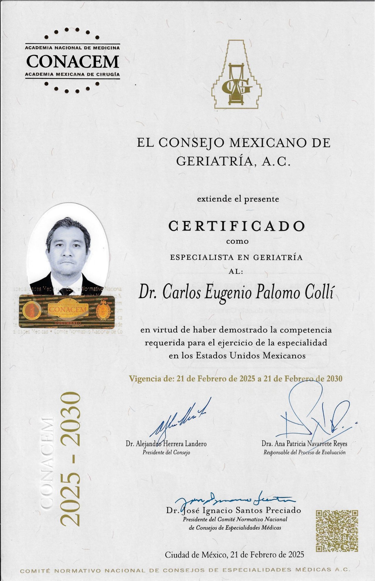 Soy Carlos Eugenio Palomo Collí, médico especialista en Medicina Interna con subespecialidad en Geriatría, formación que me permite atender adultos y personas mayores. Cuento con una amplia experiencia en la prevención, diagnóstico y tratamiento de las enfermedades mas comunes a nivel especializado, así como de las situaciones o padecimientos que aquejan frecuentemente a las personas de la tercera edad. Entre los padecimientos que frecuentemente atiendo se encuentran enfermedad de Alzheimer y otras demencias, depresión y trastorno de ansiedad, insomnio, diabetes, hipertensión arterial, infecciones respiratorias y urinarias, mareo, inestabilidad y caídas, inapetencia y desnutrición. Puedo brindarte atención en GeriaMid, clínica qué he ideado para personas mayores, así como a nivel domiciliario, hospitalario y a distancia por una videollamada.