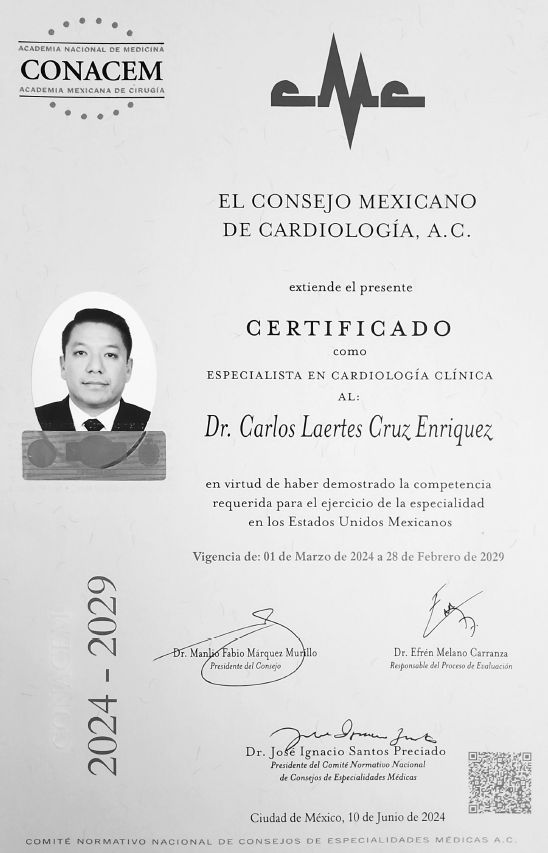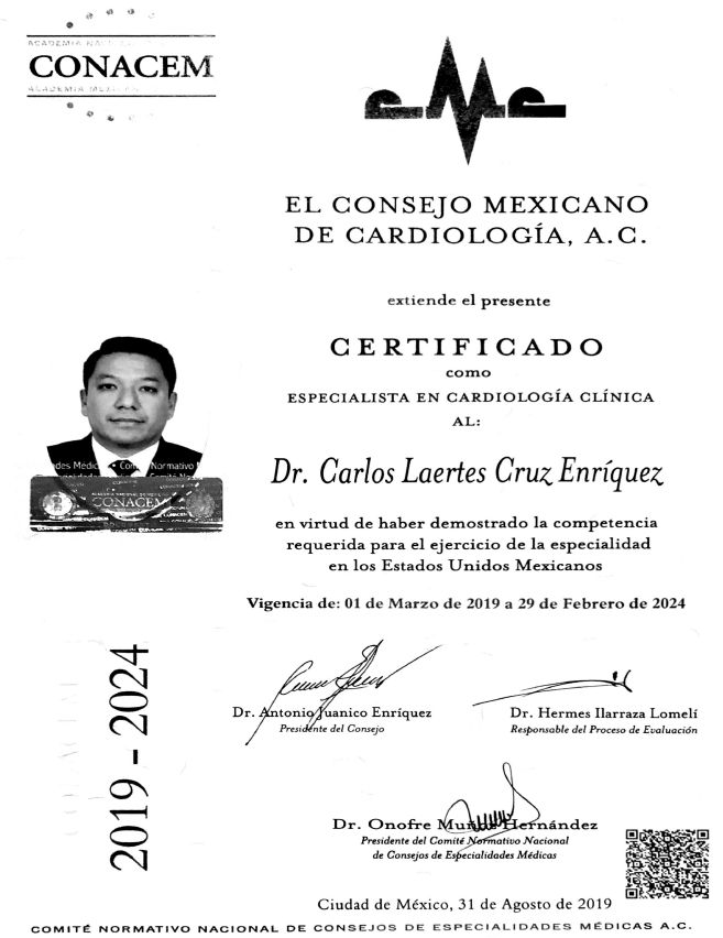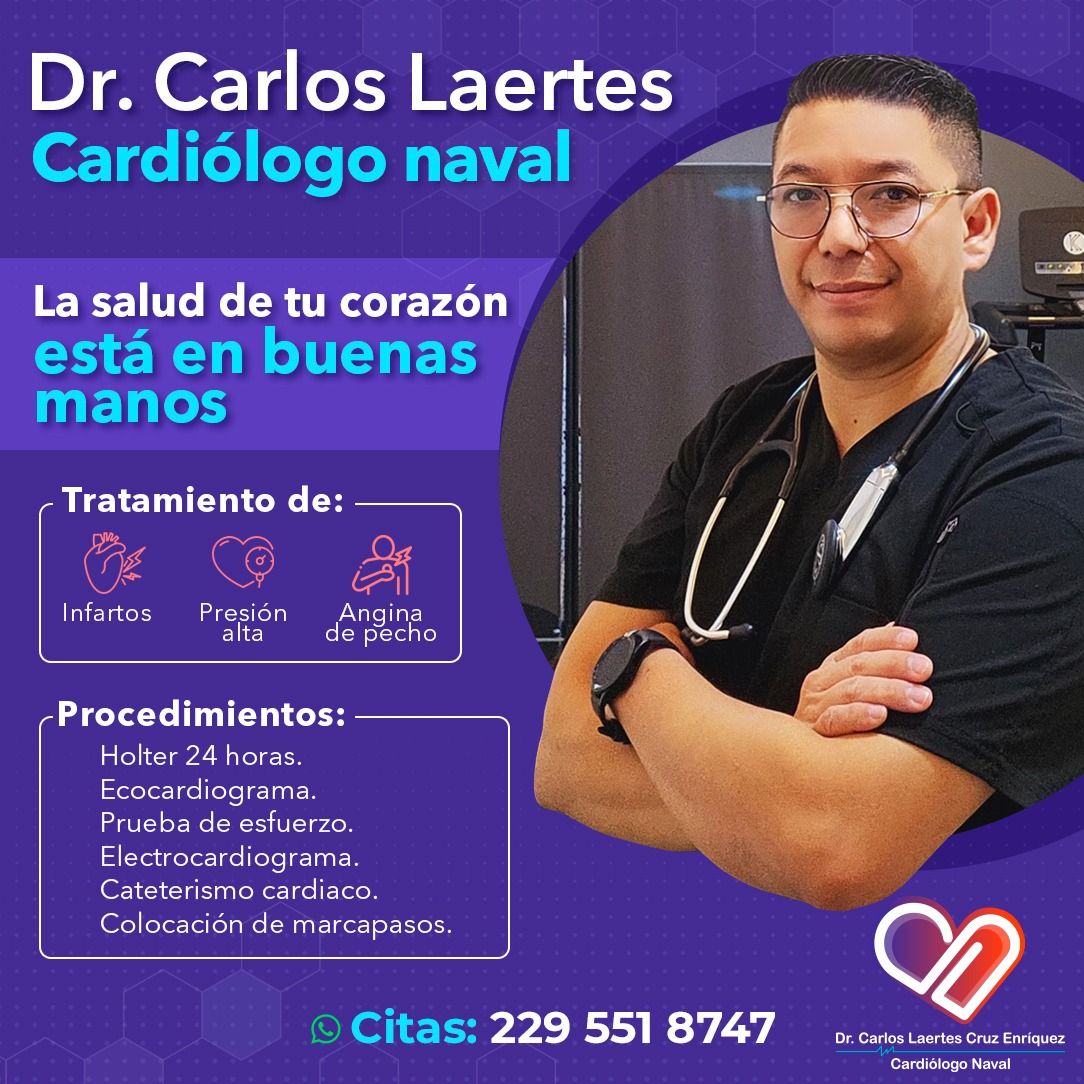 Soy el Dr. Carlos Laertes Cruz Enríquez, especialista en Cardiología, ubicado en Veracruz. Soy egresado de la Escuela Médico Naval, Secretaría de Marina-Armada de México. Me especializo en la atención de enfermedades del corazón y me encuentro permanentemente actualizado en mi campo y así brindar la mejor atención a mis pacientes. Agradezco el reconocimiento de mis pacientes por el excelente trato que ofrezco y me complace que estén satisfechos con las explicaciones detalladas y la calidad de mi atención. Espero poder ayudar a más personas a mejorar su salud y bienestar en el futuro.