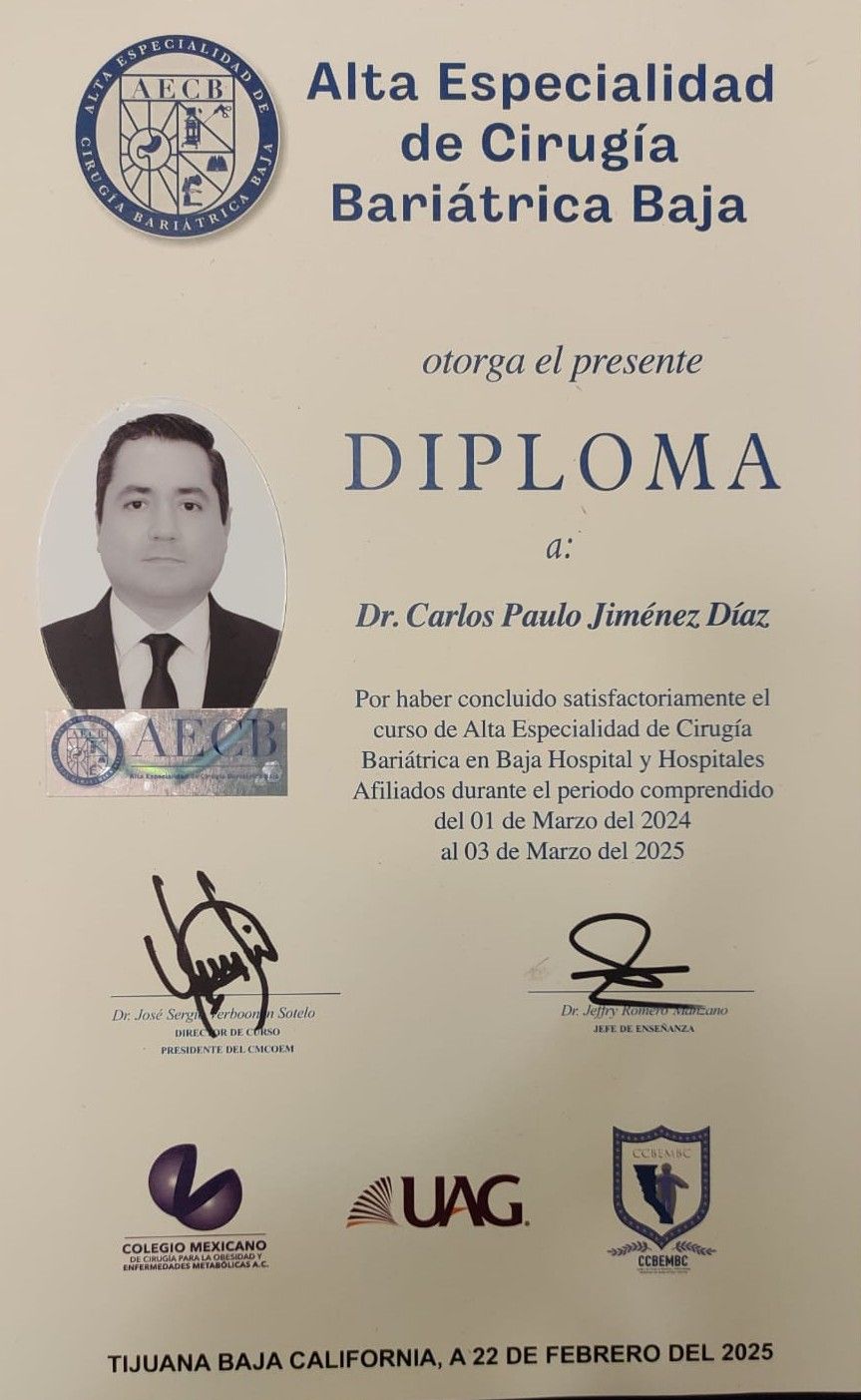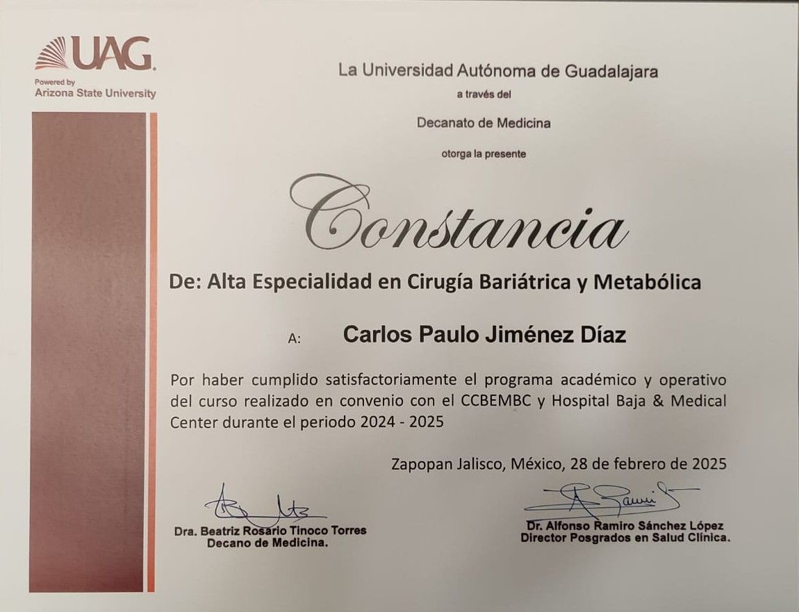Cirujano egresado del Tecnológico de Monterrey, con especialización en Laparoscopía Avanzada por el Texas Endosurgery Institute y Alta Especialidad en Cirugía Bariática y Metabólica por la Universidad Autónoma de Guadalajara.