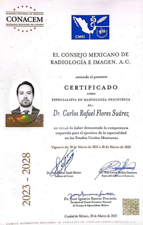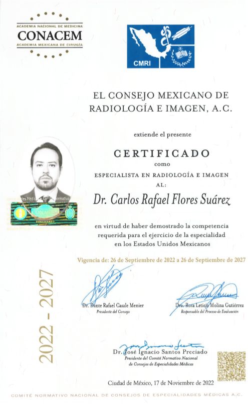 Cuento con formación en instituciones de alto prestigio y certificación vigente por el Consejo Mexicano de Radiología e Imagen, lo que respalda mi compromiso con la actualización constante y el ejercicio ético de mi profesión. Mi objetivo es ofrecer un servicio profesional, claro y confiable, trabajando en conjunto con médicos tratantes y manteniendo siempre el bienestar del paciente como prioridad.