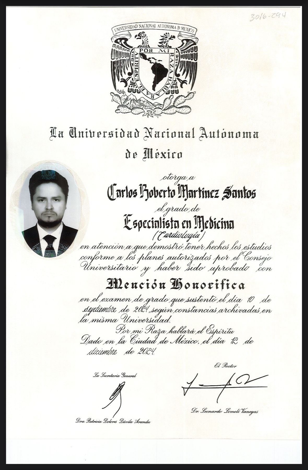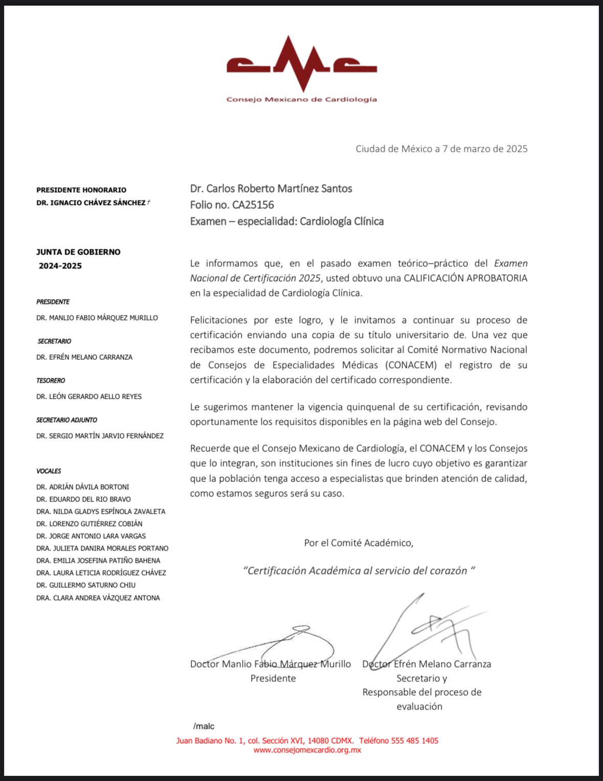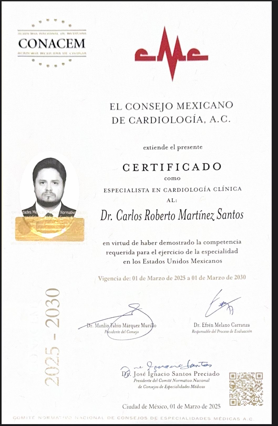 Hola soy el Dr. Carlos Roberto Martínez Santos, especialista en cardiología clínica, egresado con mención honorífica del Hospital de Cardiología del Centro Médico Nacional Siglo XXI, avalado por la Universidad Nacional Autónoma de México y certificado por el Consejo Mexicano de Cardiología.