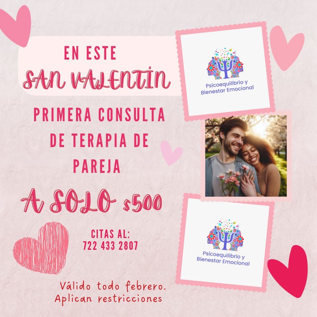 Promoción válida únicamente en la primera consulta de terapia de pareja durante el mes de febrero de 2026, para pacientes de nuevo ingreso que no tengan cancelaciones o adeudos previos. Aplican restricciones.
