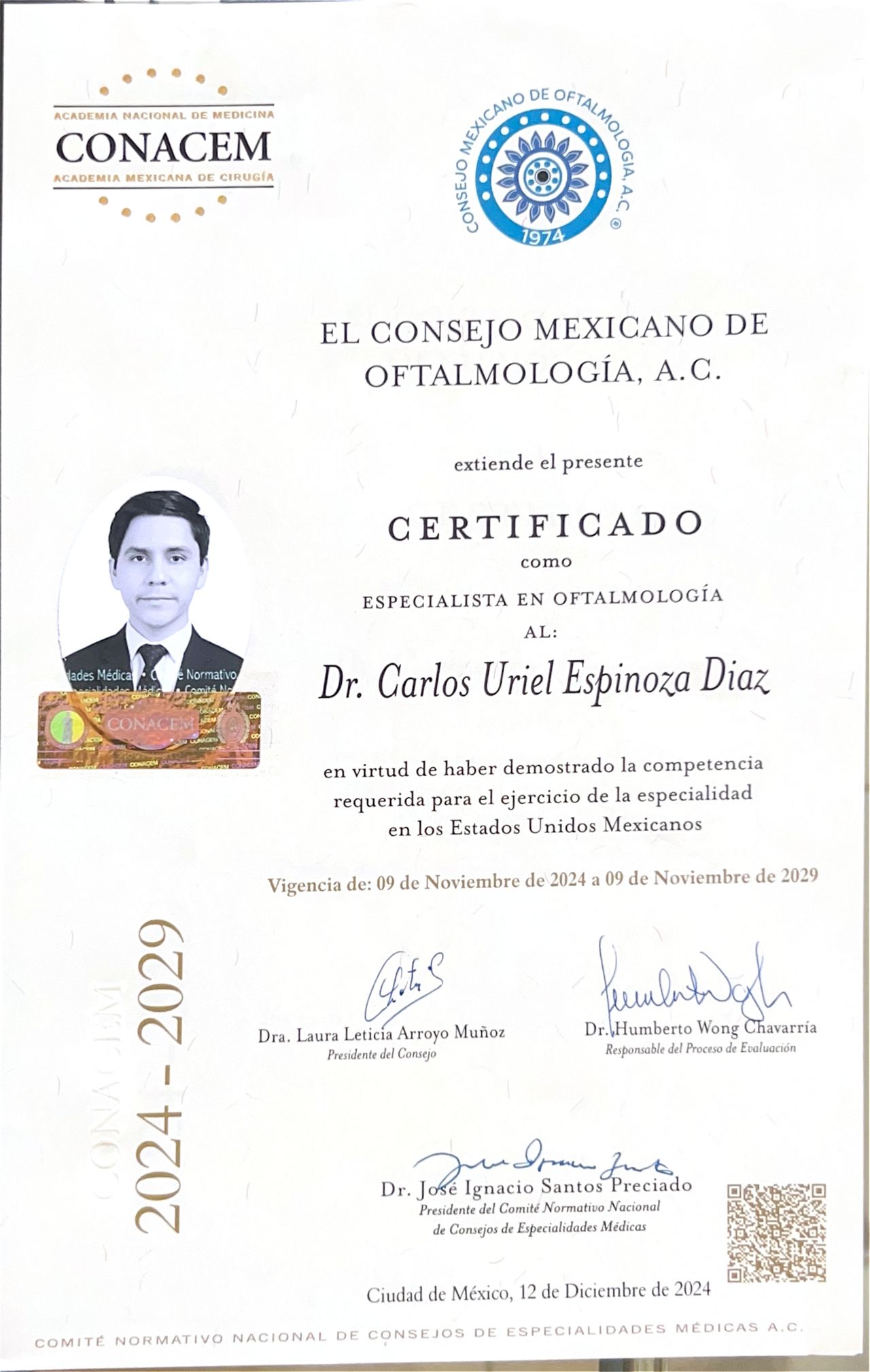 Certificado por el Consejo Mexicano de Oftalmología, lo que garantiza una práctica médica actualizada y respaldada por los más altos estándares de calidad en la especialidad.