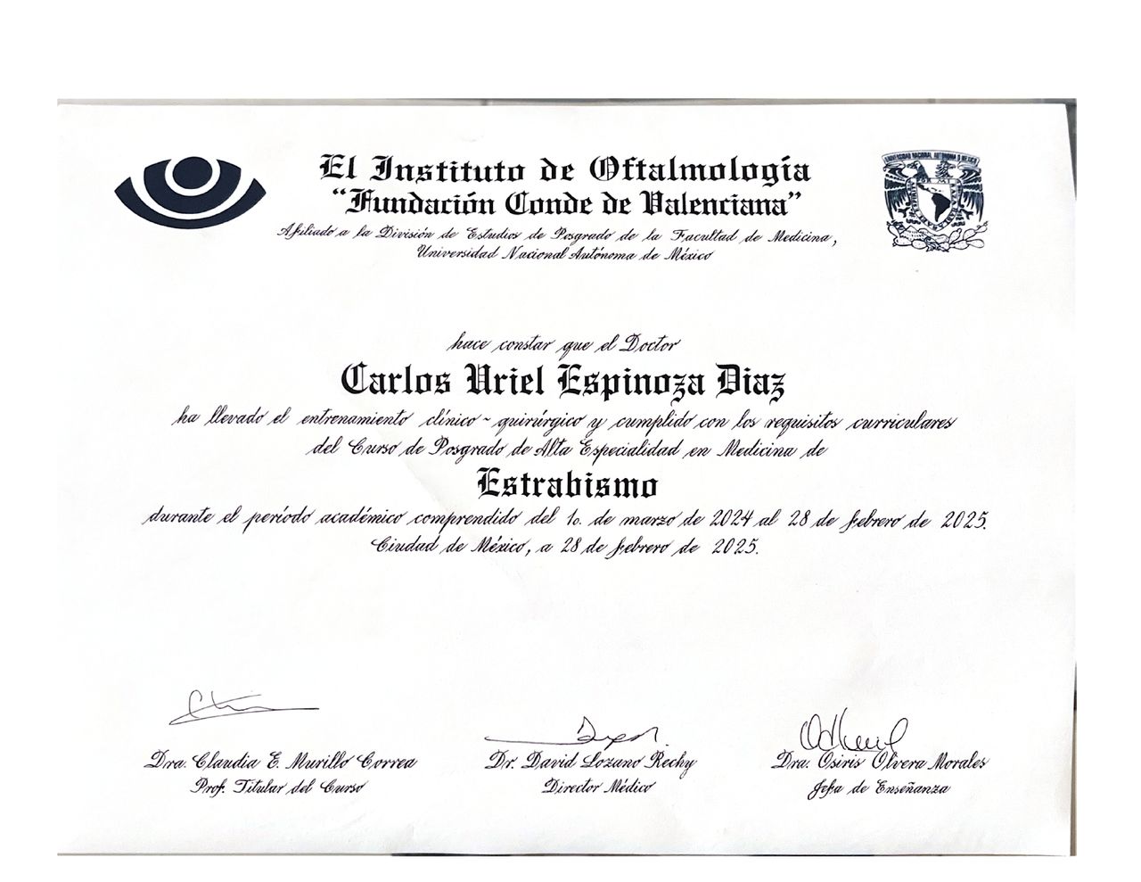 Más adelante, completé mi Alta Especialidad en Estrabismo en el Instituto de Oftalmología “Conde de Valenciana” I.A.P., uno de los centros oftalmológicos más reconocidos en Latinoamérica, especializado en casos complejos y referencia nacional en salud visual.
