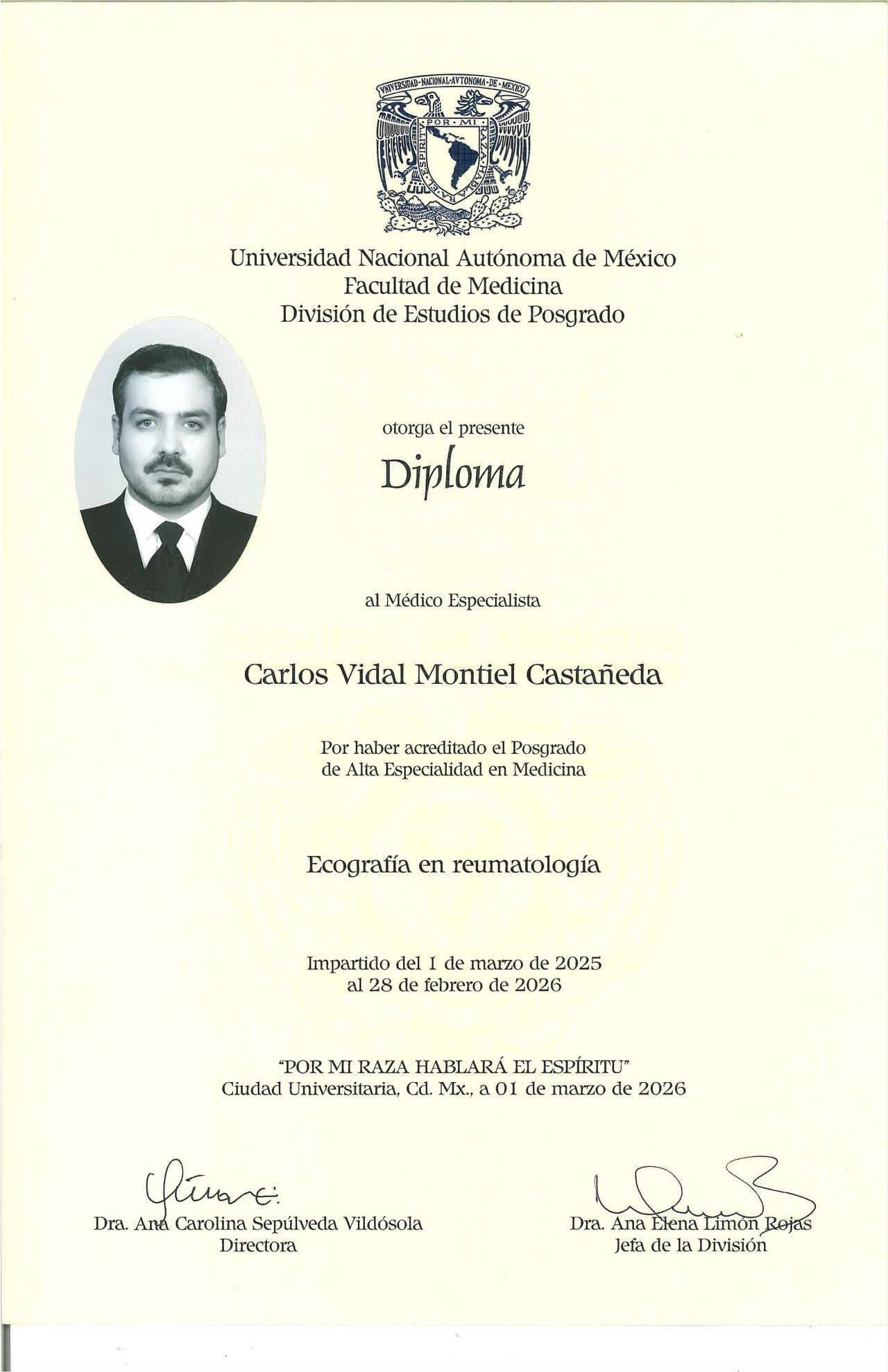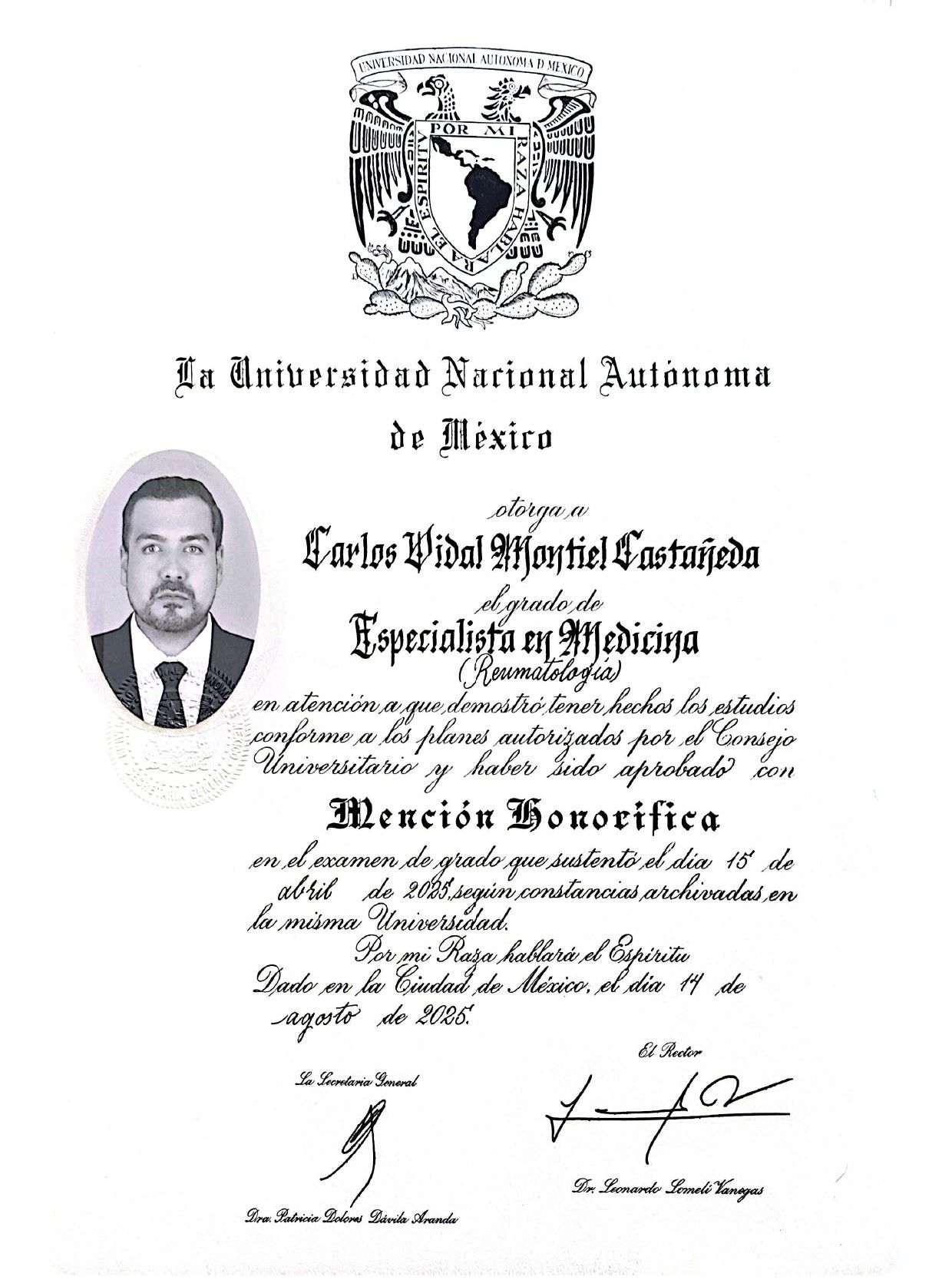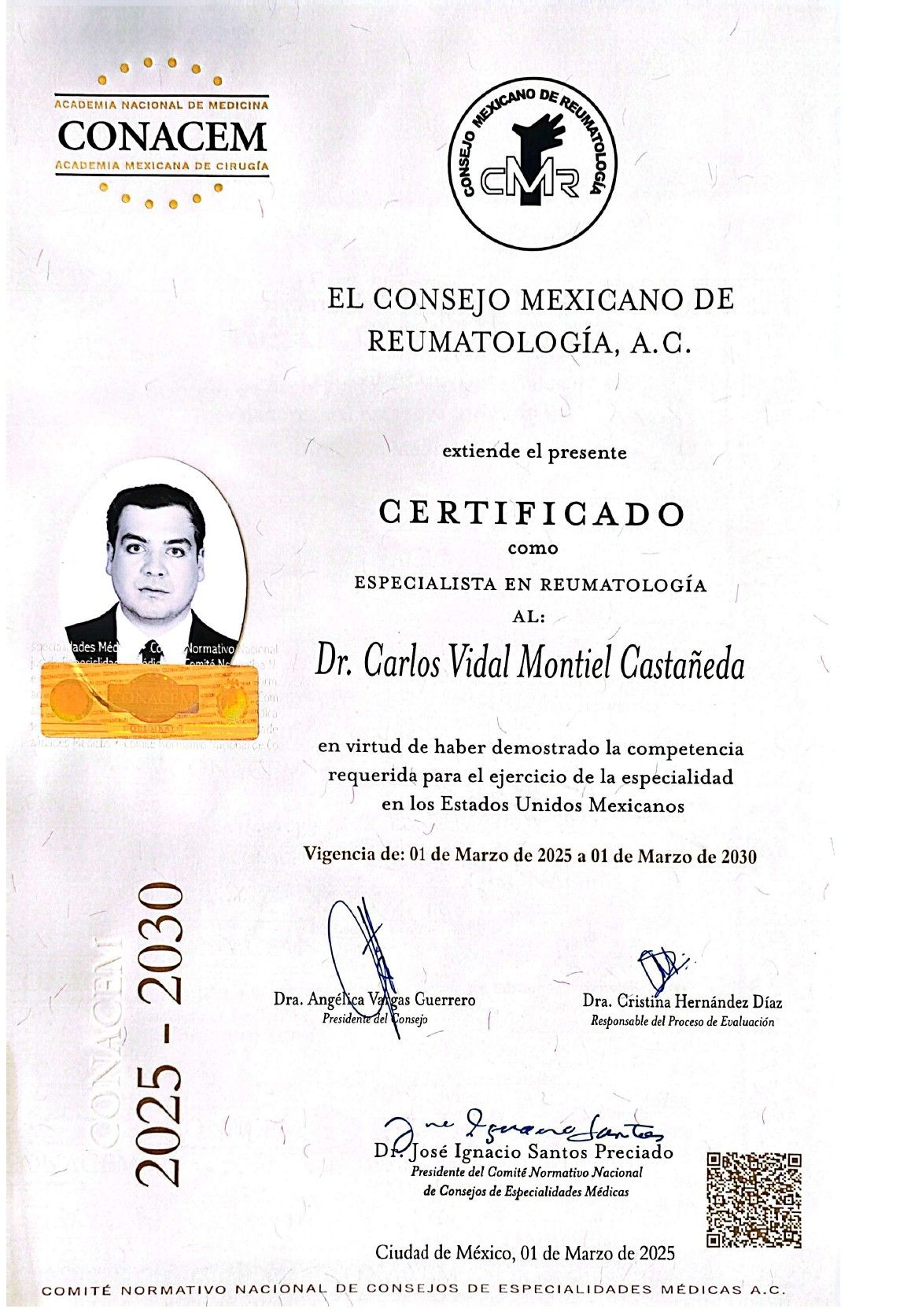 ¡Hola! Soy el Dr. Carlos Vidal Montiel Castañeda, Reumatólogo certificado por el Consejo Mexicano de Reumatología.