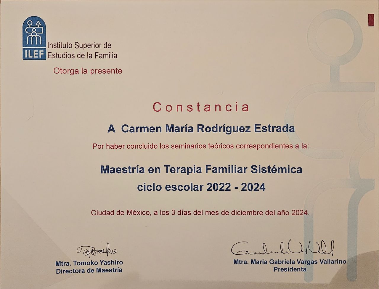 Mis sesiones con Carmen se han convertido en un espacio seguro para encontrarme y enfrentarme conmigo misma. Siempre muy profesional, he logrado conectar con su estilo de acompañamiento sincero y compasivo.