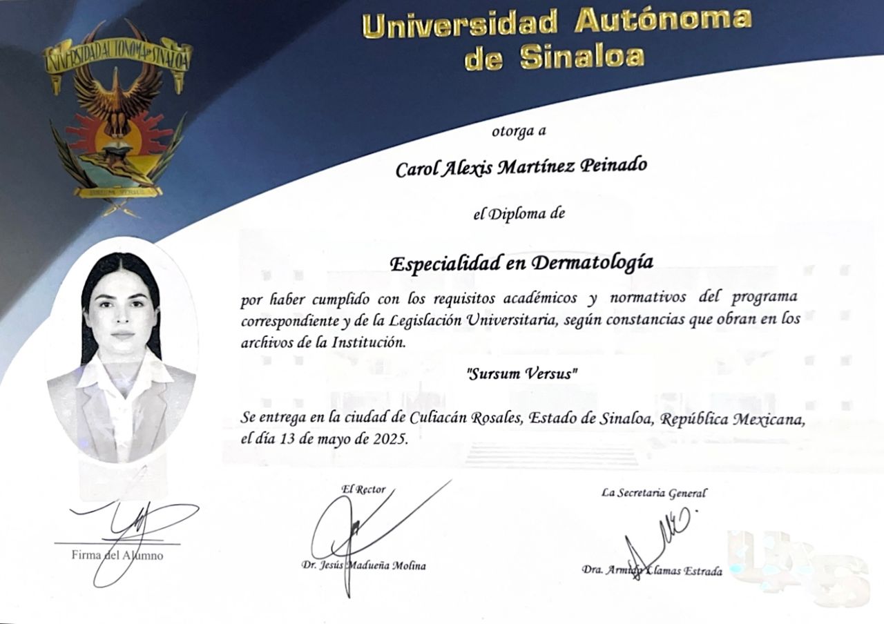 Miembro activo del Colegio Iberoamericano de Dermatología y la Sociedad Sinaloense de Dermatología.