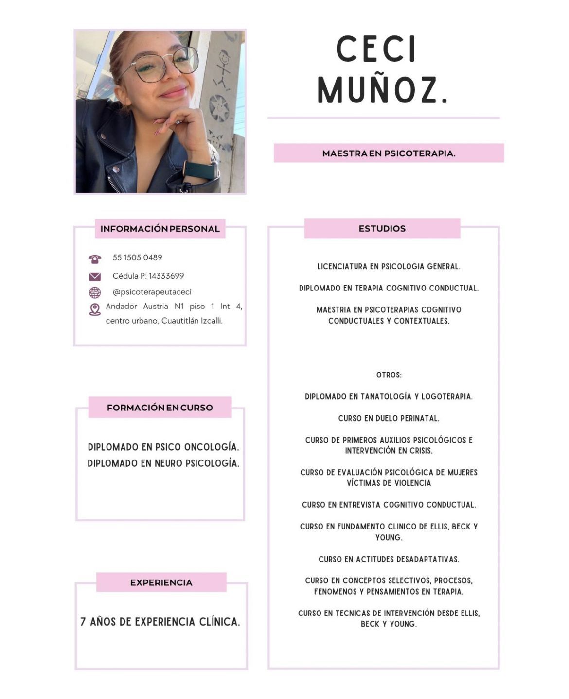 Tomar terapia con la Mtra. Ceci me ha ayudado a superar temas personales, familiares y profesionales, Ceci ha llevado mis terapias de acuerdo a mis prioridades y cuando hemos tenido que redireccionar lo ha hecho muy bien sin dejar de atender más adelante los pendientes. Considero que tome una gran decisión al buscar ayuda profesional con ella. Gracias por tu dedicación Ceci!