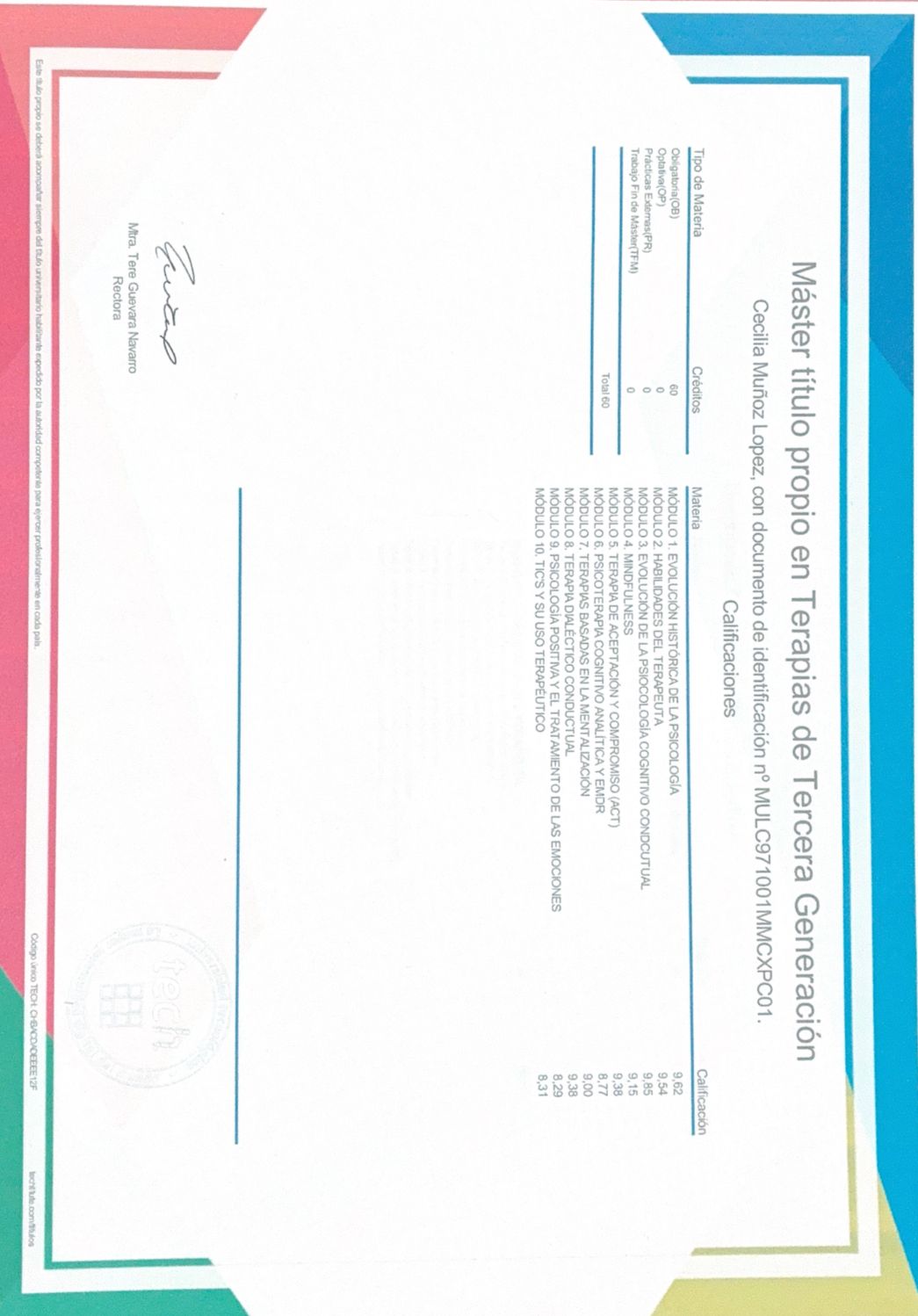Estoy especializada en Terapia Cognitivo-Conductual (TCC), Terapia de Aceptación y Compromiso (ACT), Terapia Dialéctico Conductual (DBT), tanatología y psicooncología.