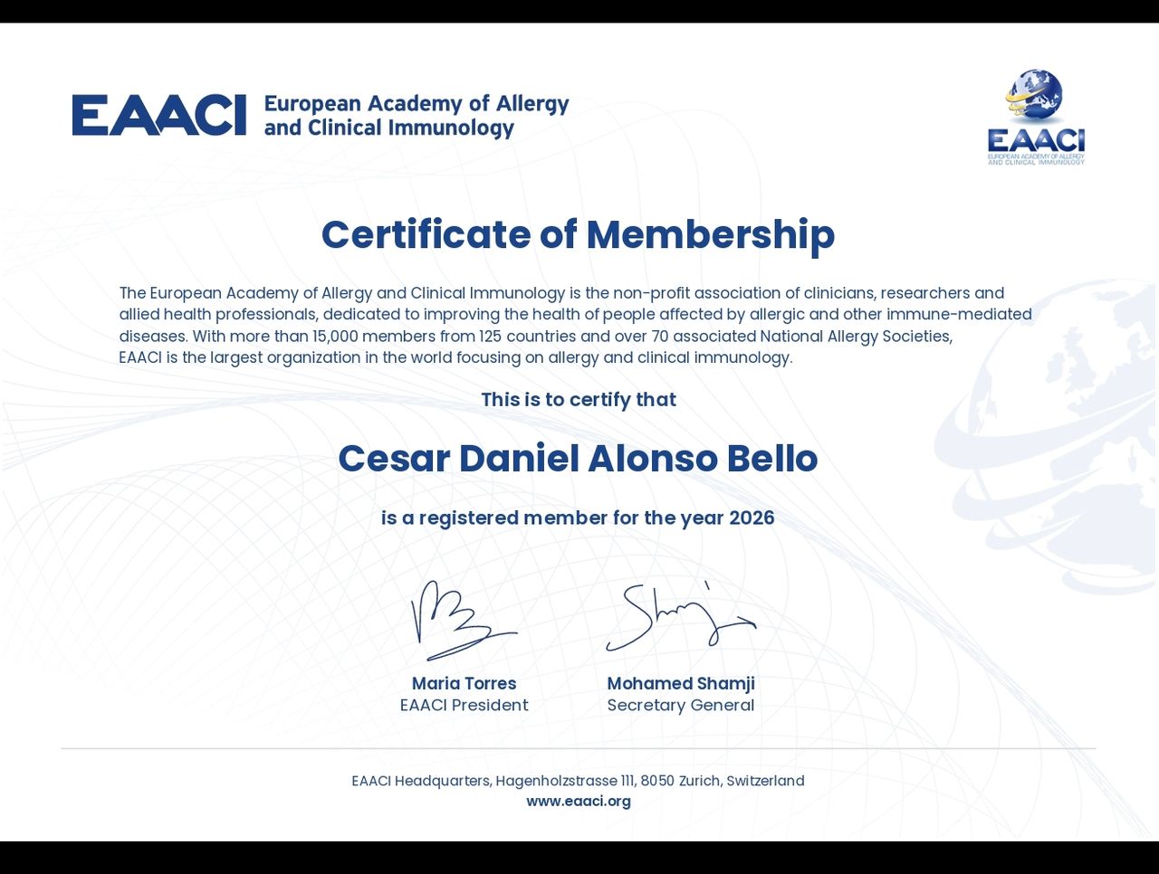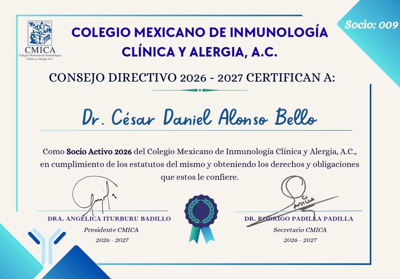 Médico Internista, egresado del Hospital Juárez de México y sub-especialista en Inmunología Clínica y Alergia, egresado del Centro Médico Nacional 20 de Noviembre en la Ciudad de México. AHORA CON ÁREA DE RETO A MEDICAMENTOS Y ALIMENTOS AMBULATORIO. CERTIFICADO VIGENTE Consejo Mexicano de Medicina Interna Consejo Nacional de Inmunología Clínica y Alergia Además de la práctica clínica y experiencia dentro de estas dos especialidades, me dedico a la investigación clínica para el desarrollo del conocimiento médico. Y actualmente tambien al diagnóstico de enfermedades raras. Puedes encontrar mis publicaciones como autor y coautor en revistas indexadas si buscas en google Alonso-Bello Cesar Daniel ó en ResearchGate Saludos y es un gusto atenderte. PRUEBAS DE ALERGIA SOLO CON VALORACIÓN PREVIA. CITAS PRESENCIALES O POR TELEMEDICINA (EN LÍNEA)