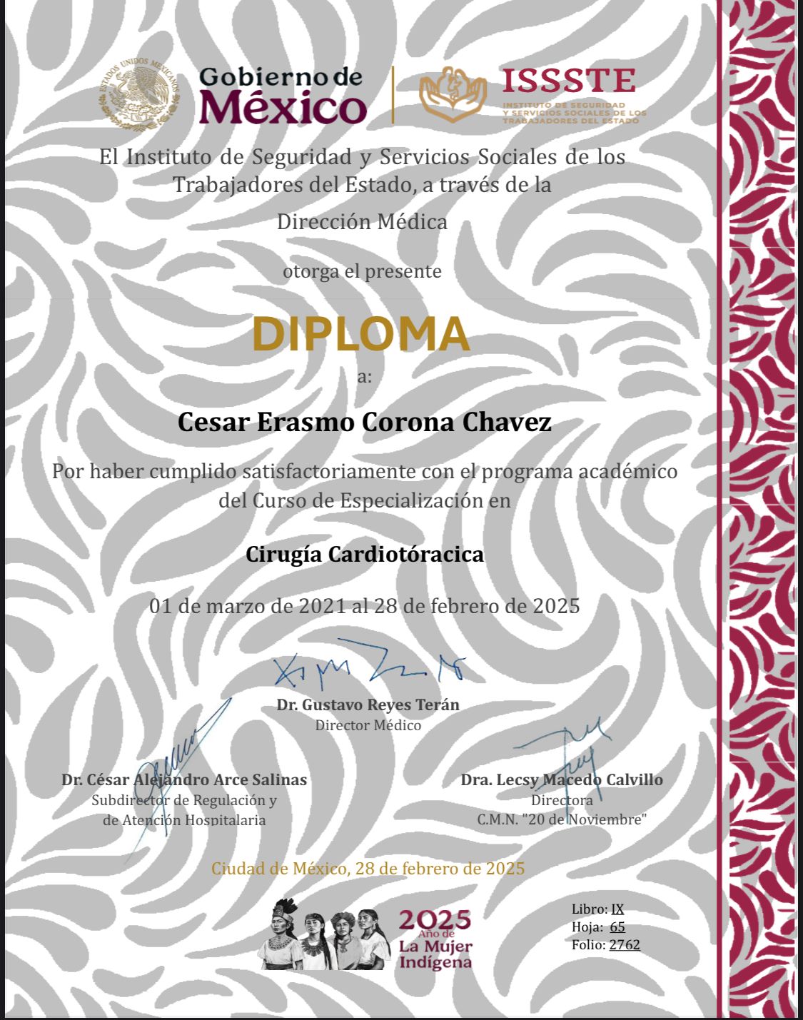 Soy médico general formado en la Universidad Autónoma de Guadalajara, formación en Cirugía General en el Hospital Civil de Tepic; Posteriormente, realicé una subespecialidad en Cirugía Cardiotorácica en el Centro Médico Nacional 20 de Noviembre (ISSSTE) en Ciudad de México, estoy certificado por el Consejo Mexicano de Cirugía del Tórax en Cirugía Cardiaca en adultos.