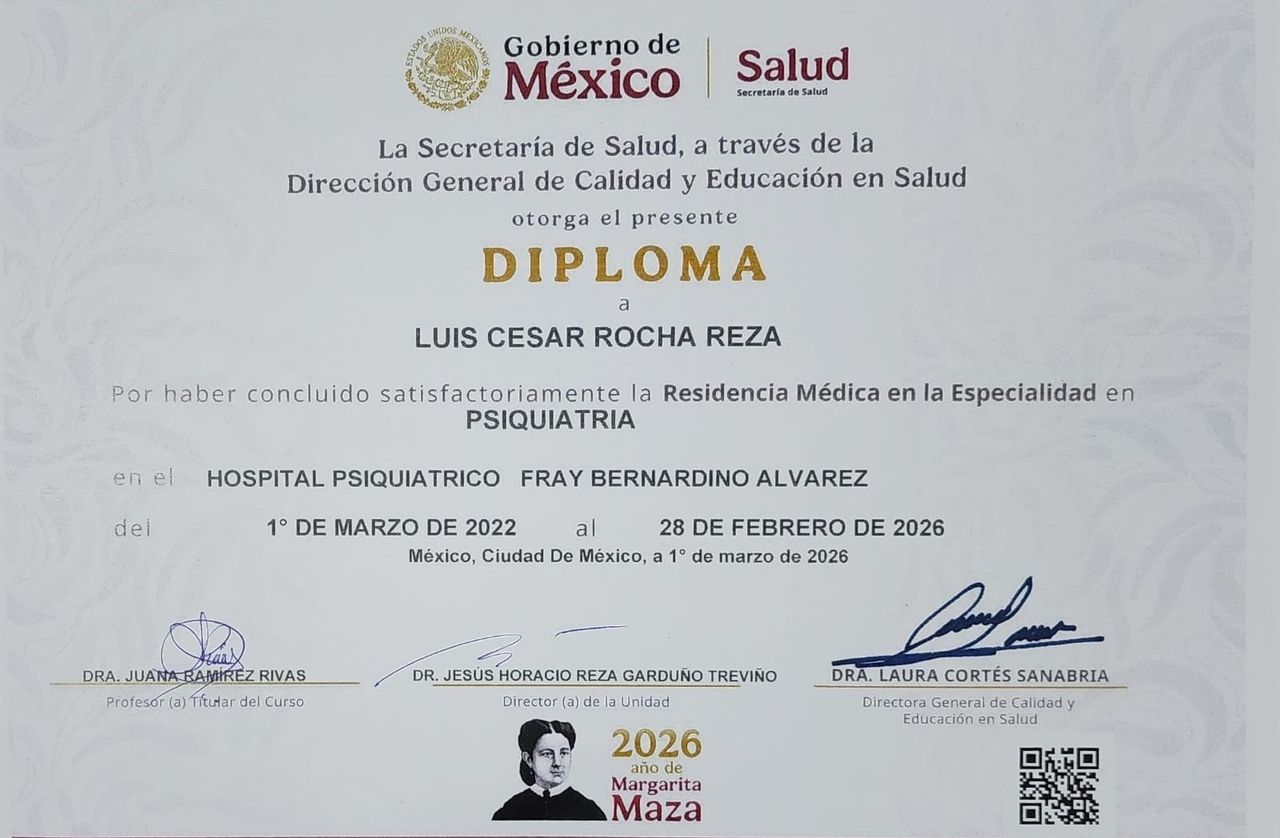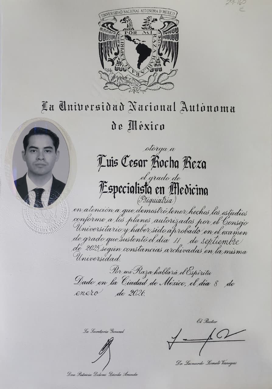 Hola! Soy César Rocha, Médico Especialista en Psiquiatría por la UNAM (Hospital Psiquiatrico Fray Bernardino Álvarez), actualmente me encuentro cursando la subespecialidad de Psiquiatría Infantil y Adolescencia en el Hospital Psiquiátrico Infantil Juan N. Navarro.
