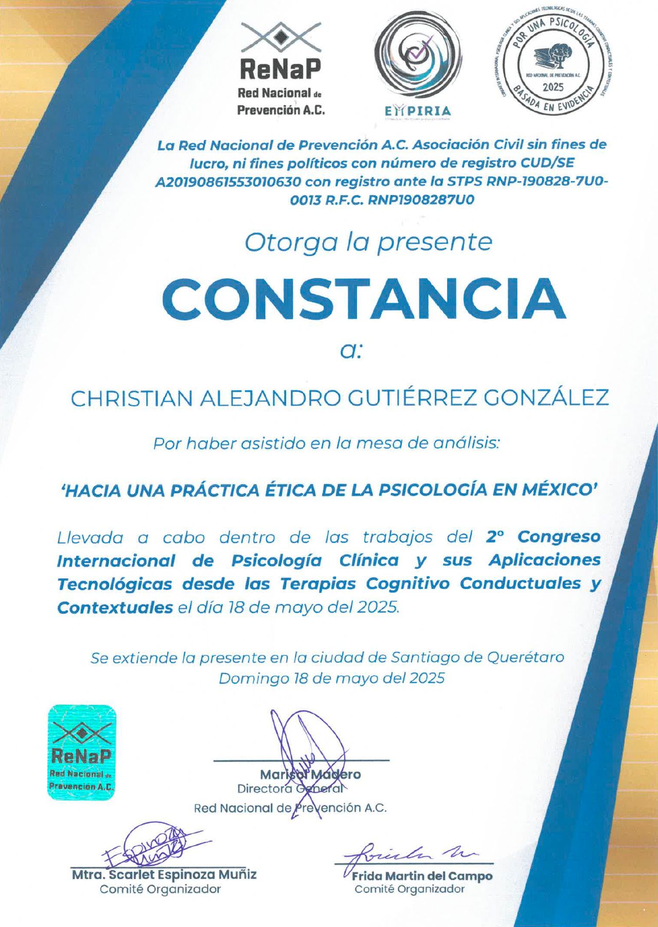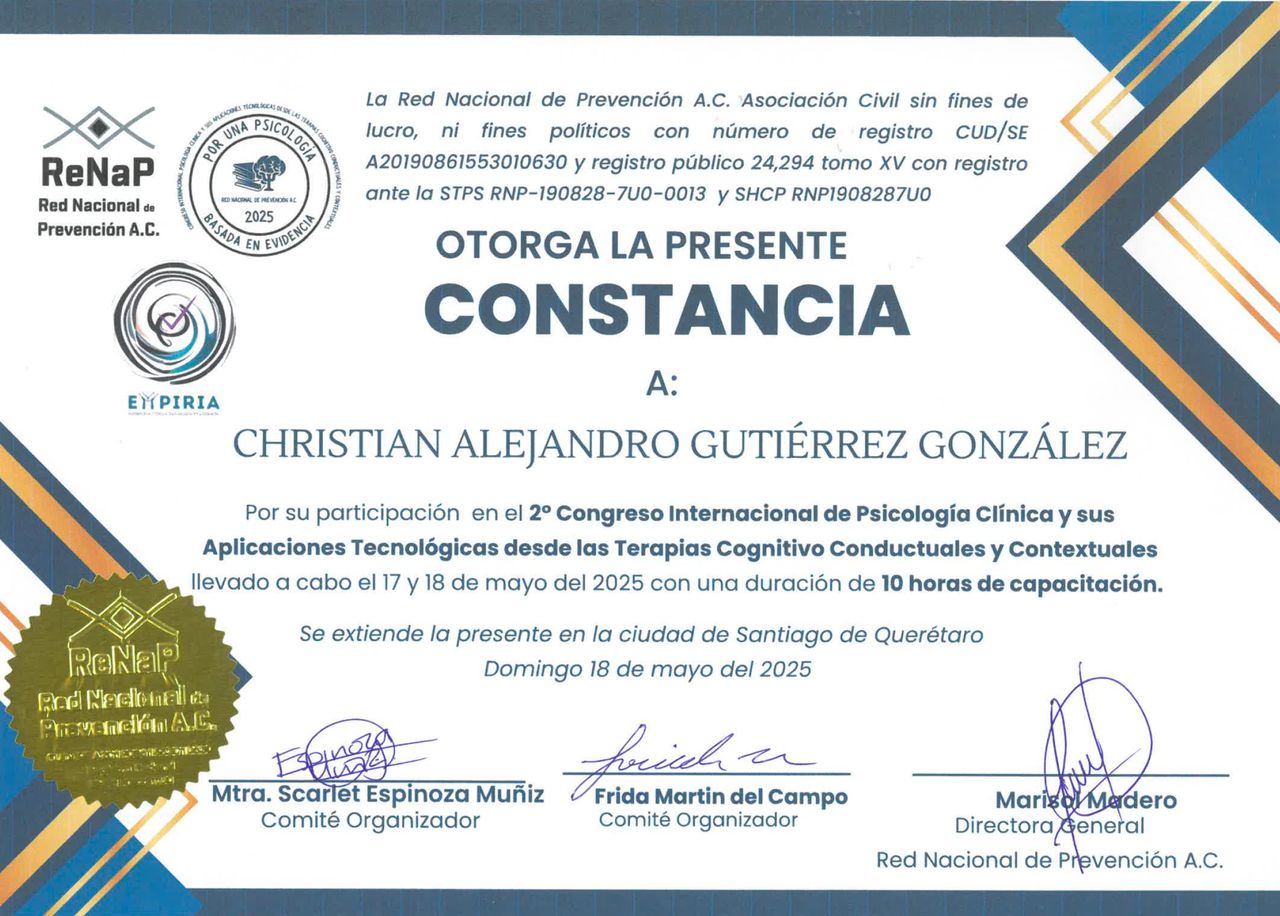 Desde la primera cita me brindó tecnicas para mejorar y me sentí comprendido. Es un profesional que constantemente se actualiza para estar al día. Brinda un seguimiento estructurado y acorde a lo que requieres.