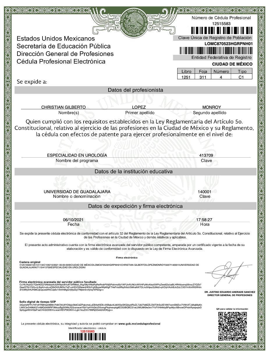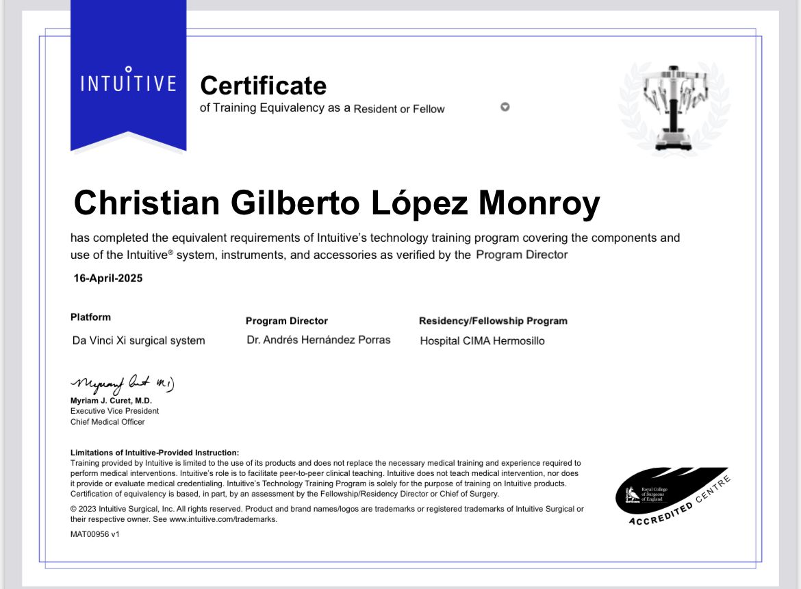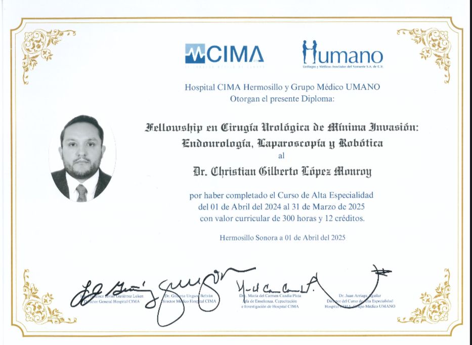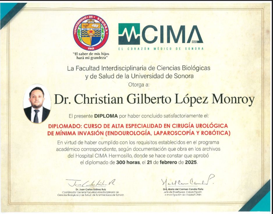 Hola, soy el Dr. Christian Gilberto López Monroy, cirujano urólogo con alta especialidad en cirugía robótica, laparoscópica y endourología. Atiendo a hombres, mujeres y niños a partir de los 3 años de edad. Actualmente ofrezco consulta en Hermosillo, Sonora y La Piedad, Michoacán.