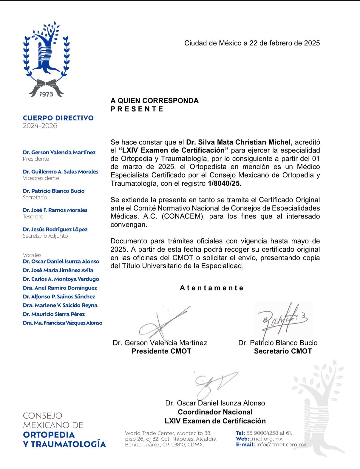 Soy médico egresado de la Facultad de Medicina de la Universidad Nacional Autónoma de México (UNAM). Posteriormente, realicé la especialidad en Traumatología y Ortopedia en la Unidad Médica de Alta Especialidad, Hospital de Traumatología y Ortopedia Lomas Verdes, donde adquirí una sólida formación en el diagnóstico y tratamiento integral de las enfermedades del sistema músculo-esquelético, y posteriormente realicé el Alta Especialidad en Reemplazo Articular.