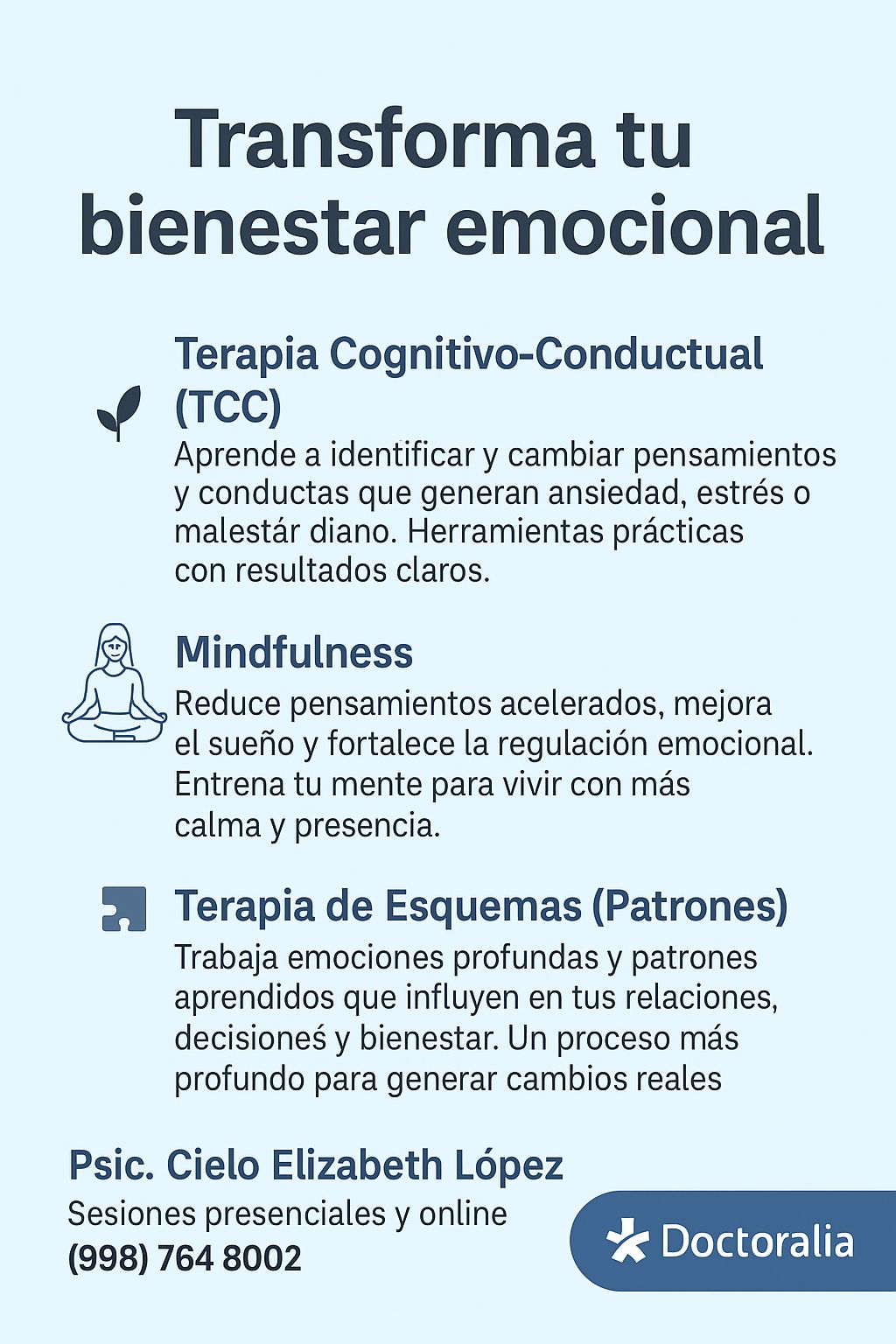 Soy la Lic. Elizabeth López, psicoterapeuta con más de 6 años de experiencia en el ámbito clínico. Cuento con una especialidad en TCC Terapia Cognitiva Conductual, un Master en Mindfulness y una Master en Neuropsicología, lo que me permite ofrecer un enfoque integral y personalizado con un tratamiento estructurado dirigido a diversos trastornos psicológicos y problemas del estado de ánimo.