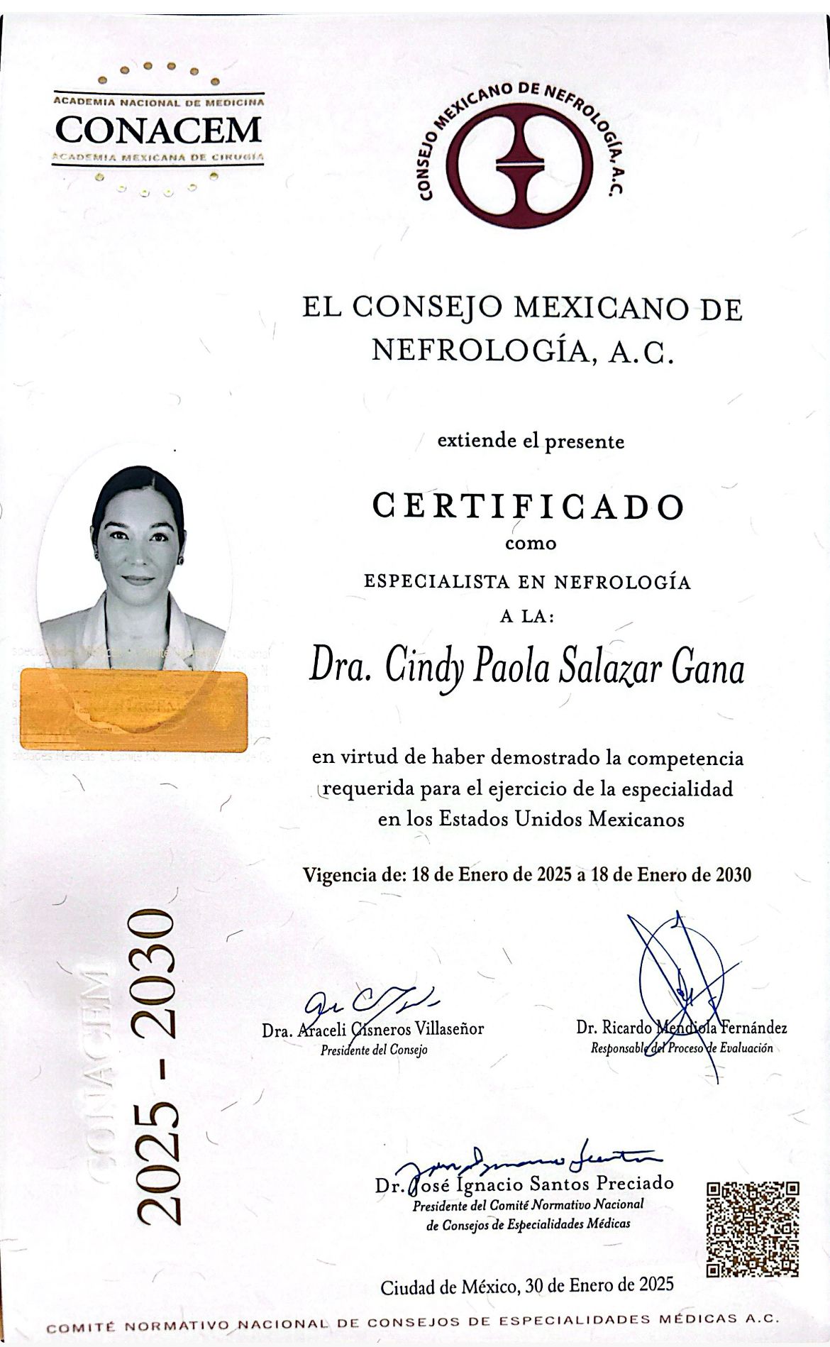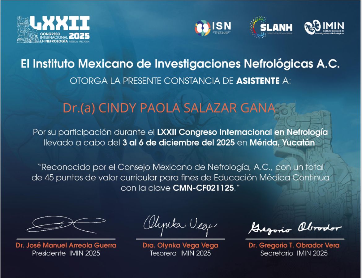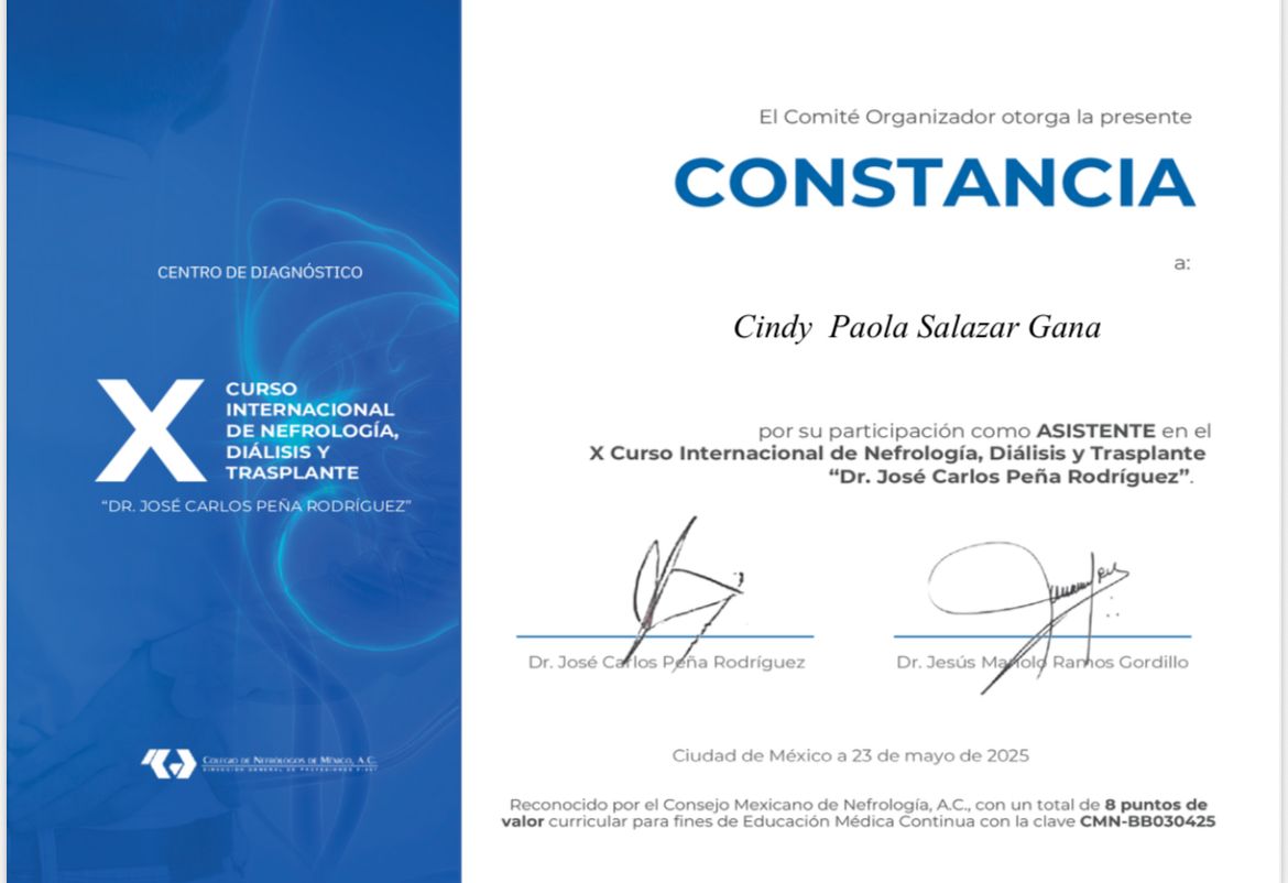 Egresada de la Unidad Médica de Alta Especialidad IMSS de Ciudad Obregón, Sonora, certificada por el Consejo Mexicano de Nefrología. Actualmente laborando en IMSS HGR1 Culiacán, Sinaloa.