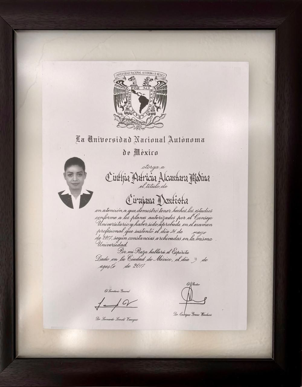 Soy la Dra. Cinthia Alcantara, me gustaría que te atiendas conmigo ya que cuento con más de 17 años de experiencia en la odontología. Me gusta mucho el área de la salud, algo que me caracteriza es mi trato humanizado con los pacientes. Realice mi Licenciatura en la Facultad de Odontología de la UNAM en Ciudad Universitaria. Cuento con la carrera técnica en Prótesis Dental. Al igual, tengo un diplomado en el CNEAC en ortodoncia. Un curso de ortodoncia invisible. Actualmente sigo actualizándome en congresos anuales de la facultad de odontología.