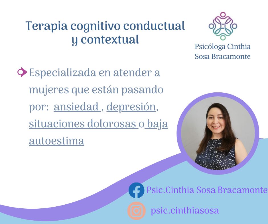 ¡Hola, soy Cinthia!, a lo largo de mis años dando psicoterapia me he dedicado a atender a mujeres que están pasando por ansiedad, depresión, (la cual se puede ver como desgano, desmotivación, apatía) y baja autoestima, lo que muchas veces llega con sentimientos de insuficiencia y poca valía.