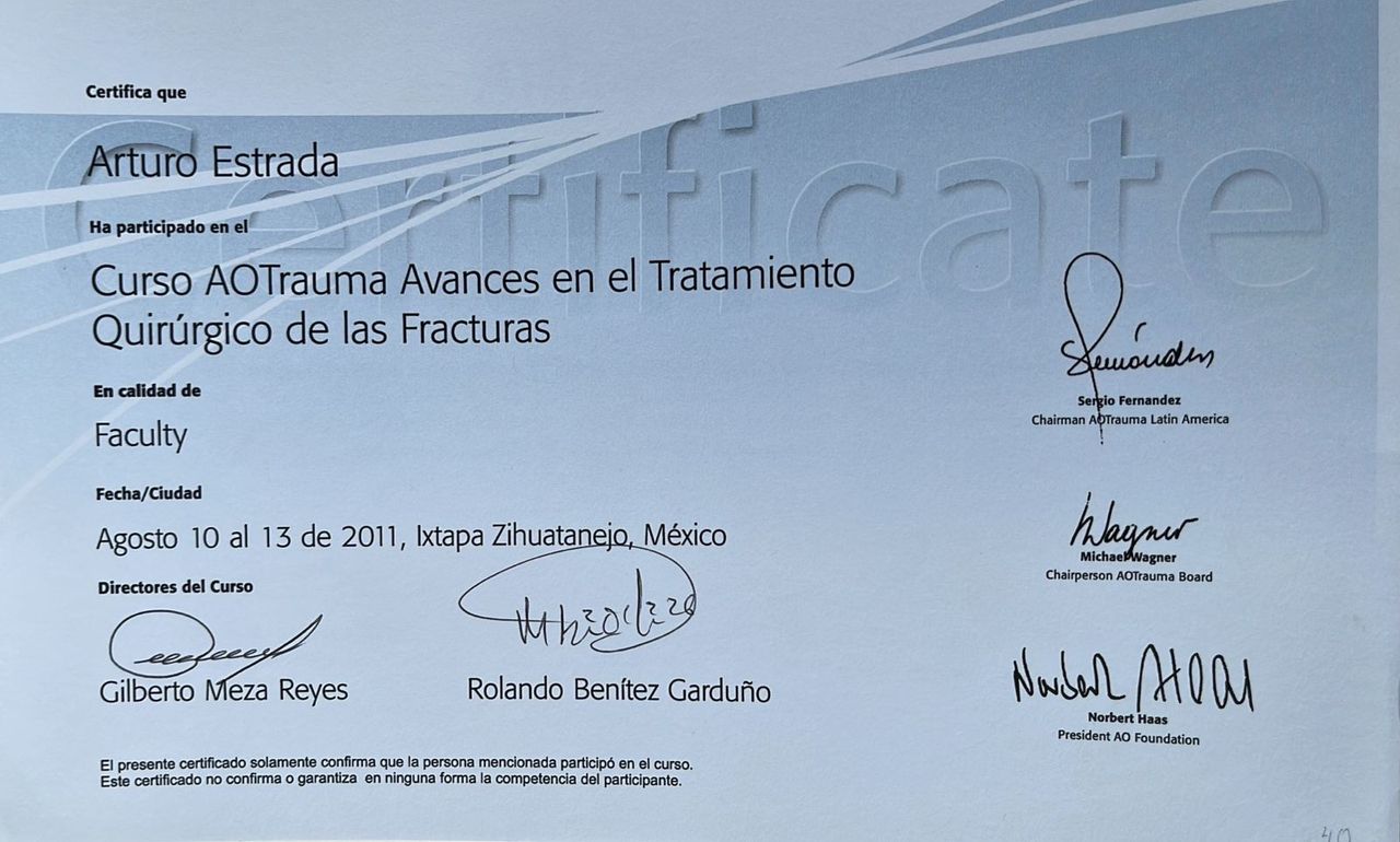 Cuenta con formación y actualización continua en trauma, fracturas y cirugía articular, incluyendo entrenamiento en artroscopia de hombro en centros de prestigio nacional e internacional. Ha participado como profesor y ponente en cursos y jornadas académicas, manteniéndose a la vanguardia en técnicas quirúrgicas modernas.