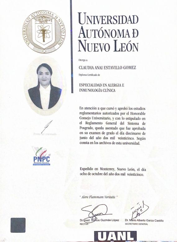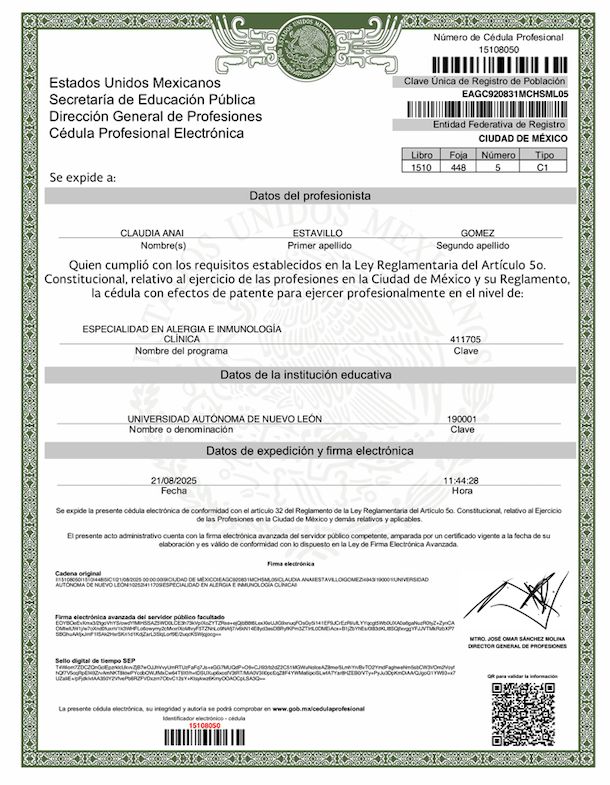 Soy la Dra. Anai Estavillo egresada de la Universidad Autónoma de Ciudad Juárez, con formación especializada en Alergología e Inmunología Clínica en el hospital universitario “Dr. José Eleuterio González” por la Universidad Autónoma de Nuevo León, certificada por el consejo nacional de inmunología clínica y alergia. Mi compromiso es ofrecer atención médica integral, actualizada y personalizada para el diagnóstico, tratamiento y control de enfermedades alérgicas e inmunológicas en pacientes de todas las edades. Cuento con una sólida formación académica y experiencia clínica en el manejo de alergias respiratorias, alimentarias, cutáneas y farmacológicas. Estoy aquí para ayudarte a mejorar tu calidad de vida con un enfoque humano y basado en la evidencia.
