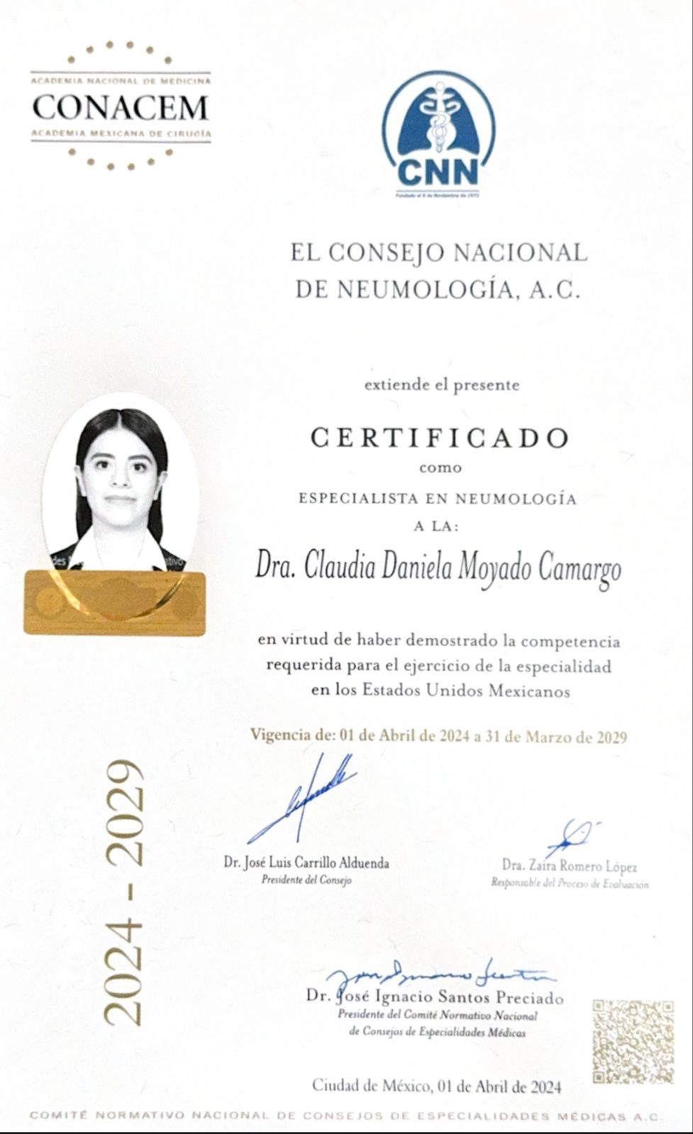 Soy Neumóloga certificada por el Consejo Nacional de Neumología (2024) y realicé mi especialidad en el Centro Médico Nacional La Raza, con aval universitario por la UNAM. Soy Médico Cirujano y Partero por el Instituto Politécnico Nacional.