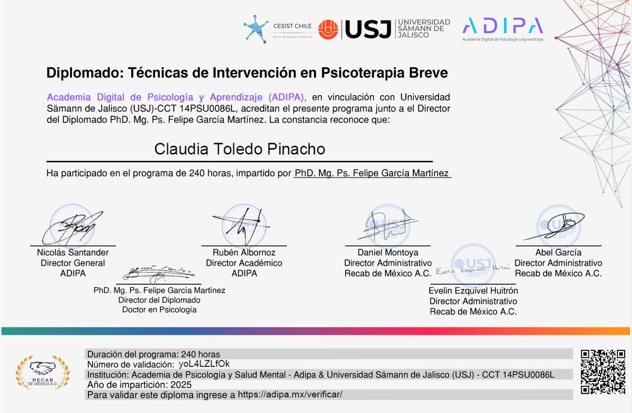 Actualmente, estoy cursando la Maestría en Psicoterapia de Tercera Generación, lo que me permite integrar las herramientas más actualizadas y basadas en evidencia (como la Terapia de Aceptación y Compromiso) en mi práctica, combinándolas con mi formación previa en Terapia Breve.