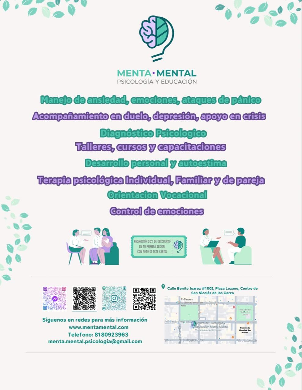 Brindamos atención psicológica a adolescentes y adultos con modalidad presencial en el centro de San Nicolás de los Garza, Nuevo León, y en línea, para lidiar con las diferentes circunstancias que afectan el bienestar, como: