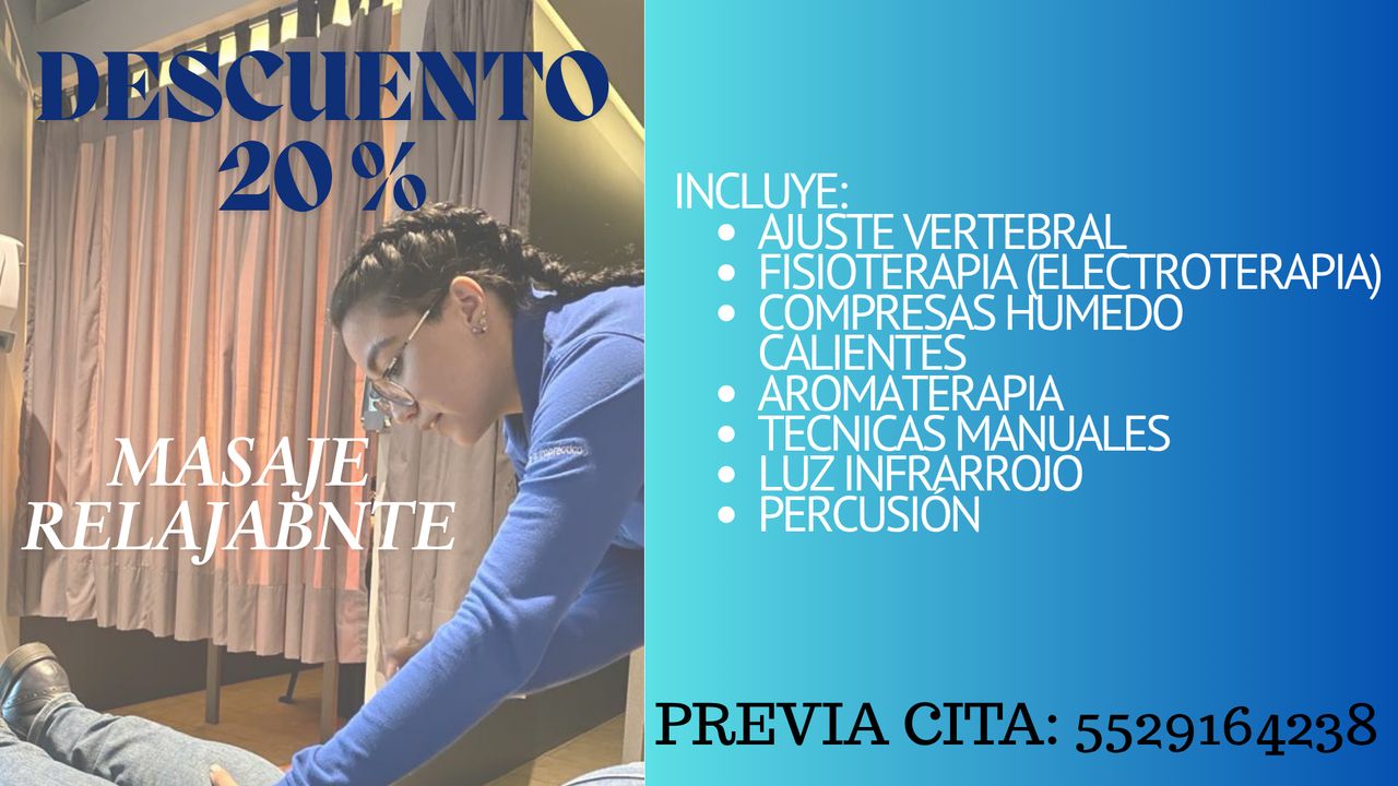 Este mes tenemos promoción del 20% de descuento en masaje relajante, agenda aquí en DOCTORALIA o llama al 5529164238. ¡¡Te esperamos!! Los encargados de realizarlo son el personal de fisioterapia y quiroprácticos, puede variar quien le realice el masaje.
