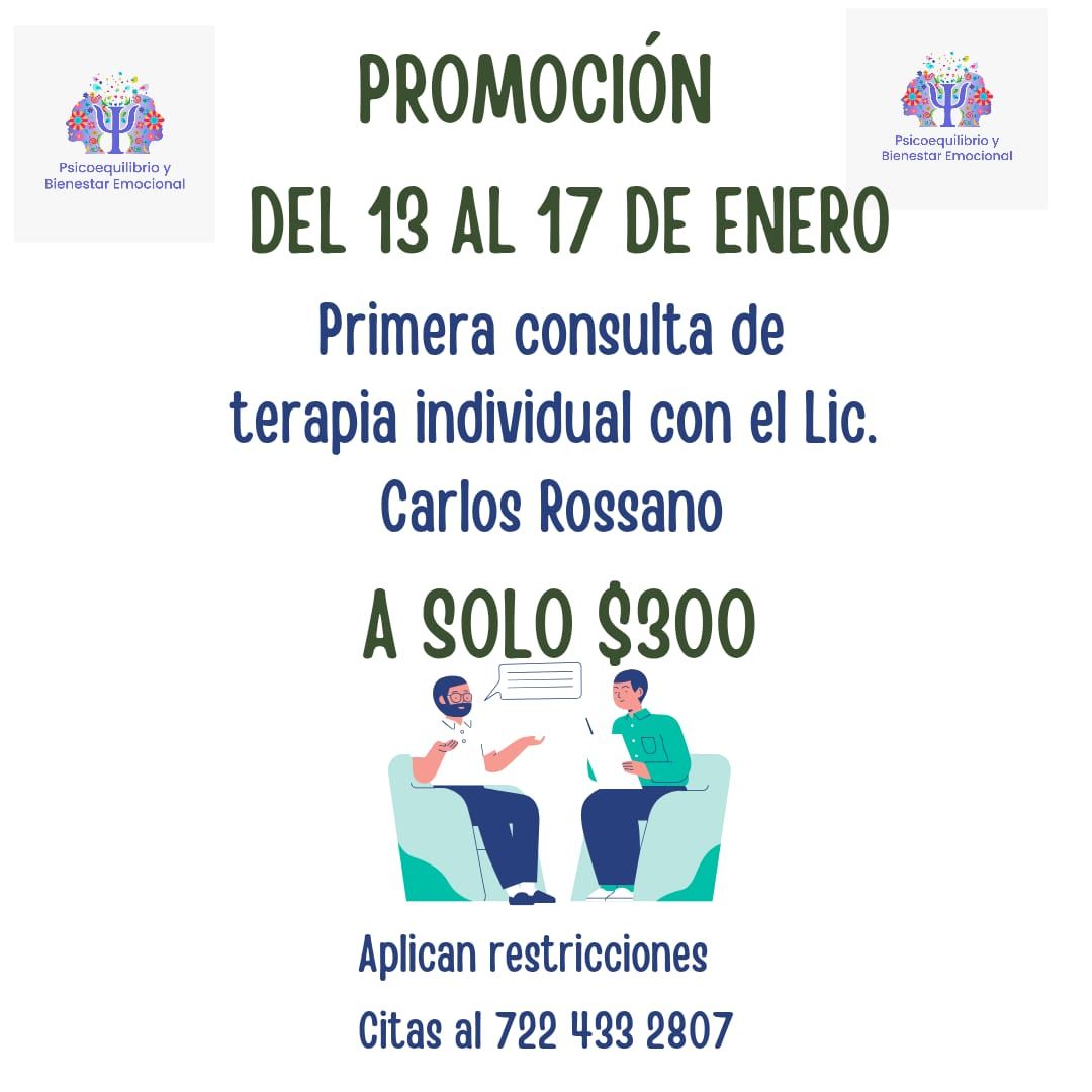 Promoción válida para pacientes de nuevo ingreso que no tengan cancelaciones previas, en terapia individual (presencial o en línea) (adolescentes y adultos) del 13 al 17 de enero. En consulta con el Lic. Carlos Rossano. Aplican restricciones.