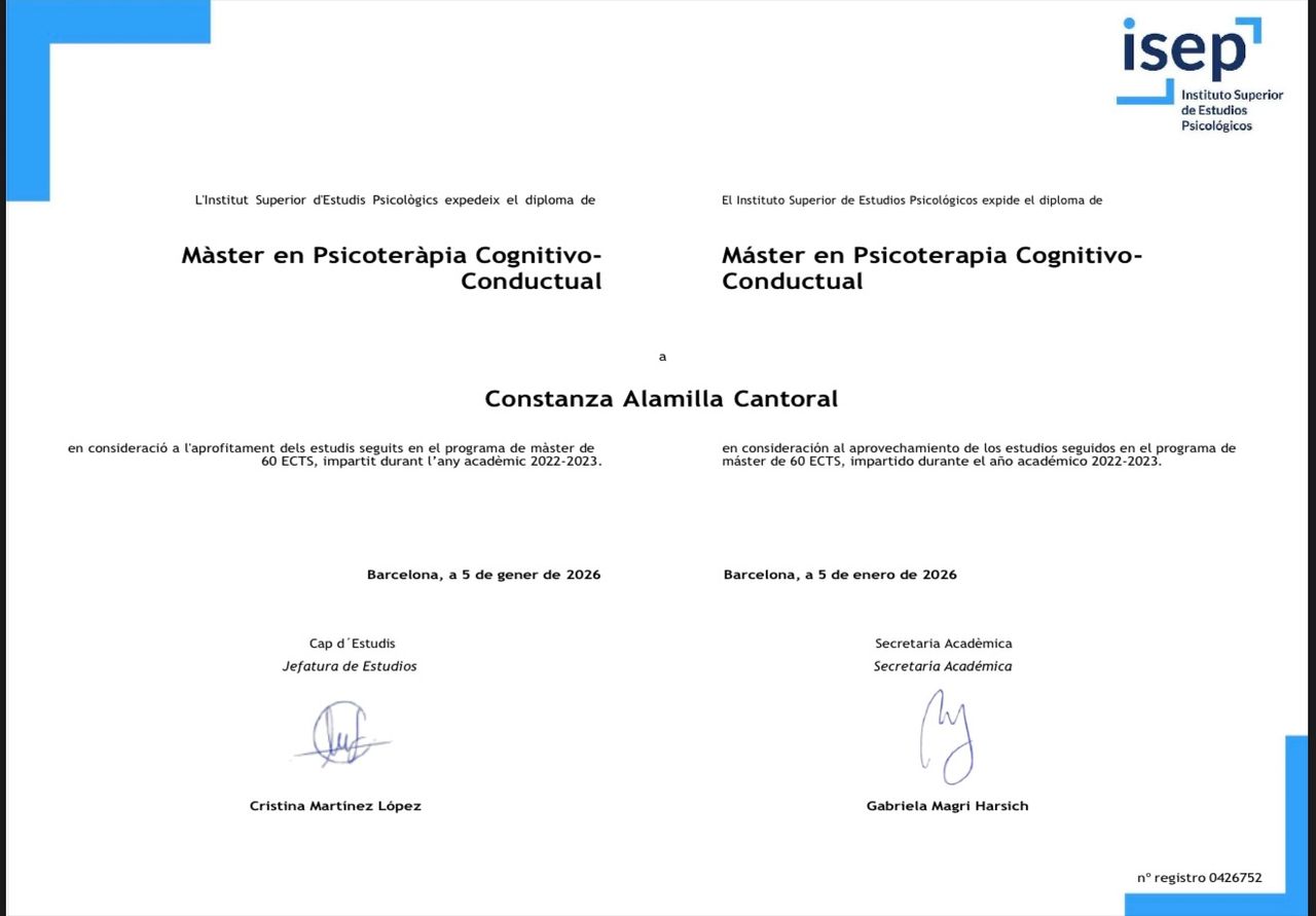 Soy psicóloga clínica especializada en Terapia Cognitivo-Conductual.