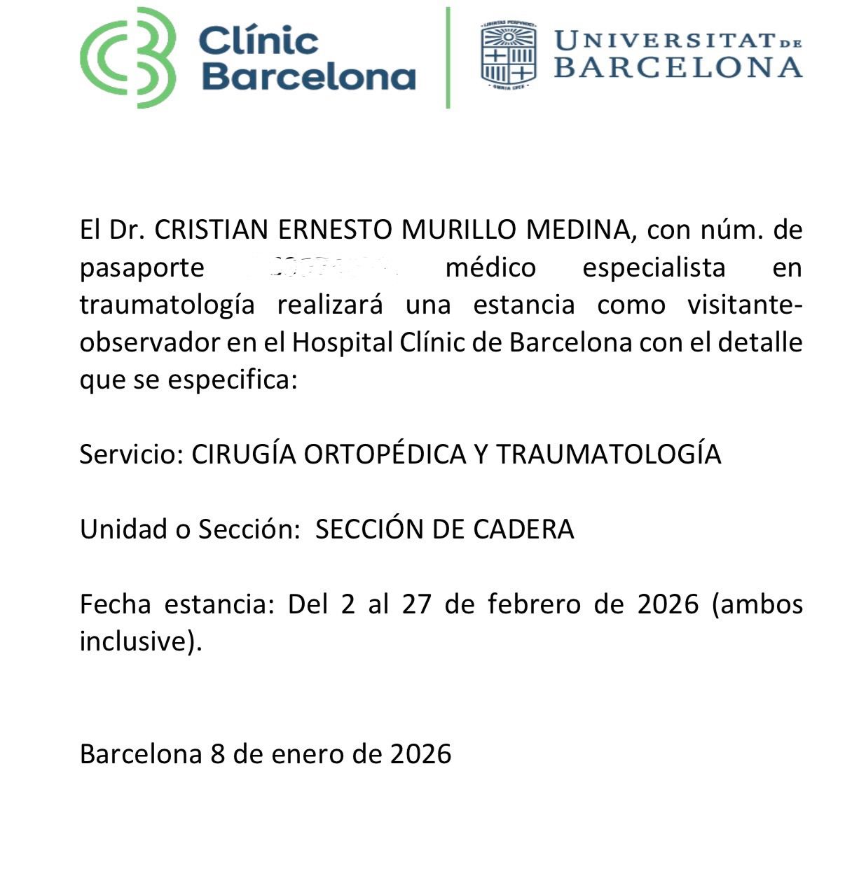 Realicé un curso clínico y práctico en Cirugía de Cadera en el Hospital Clinic de Barcelona, España.