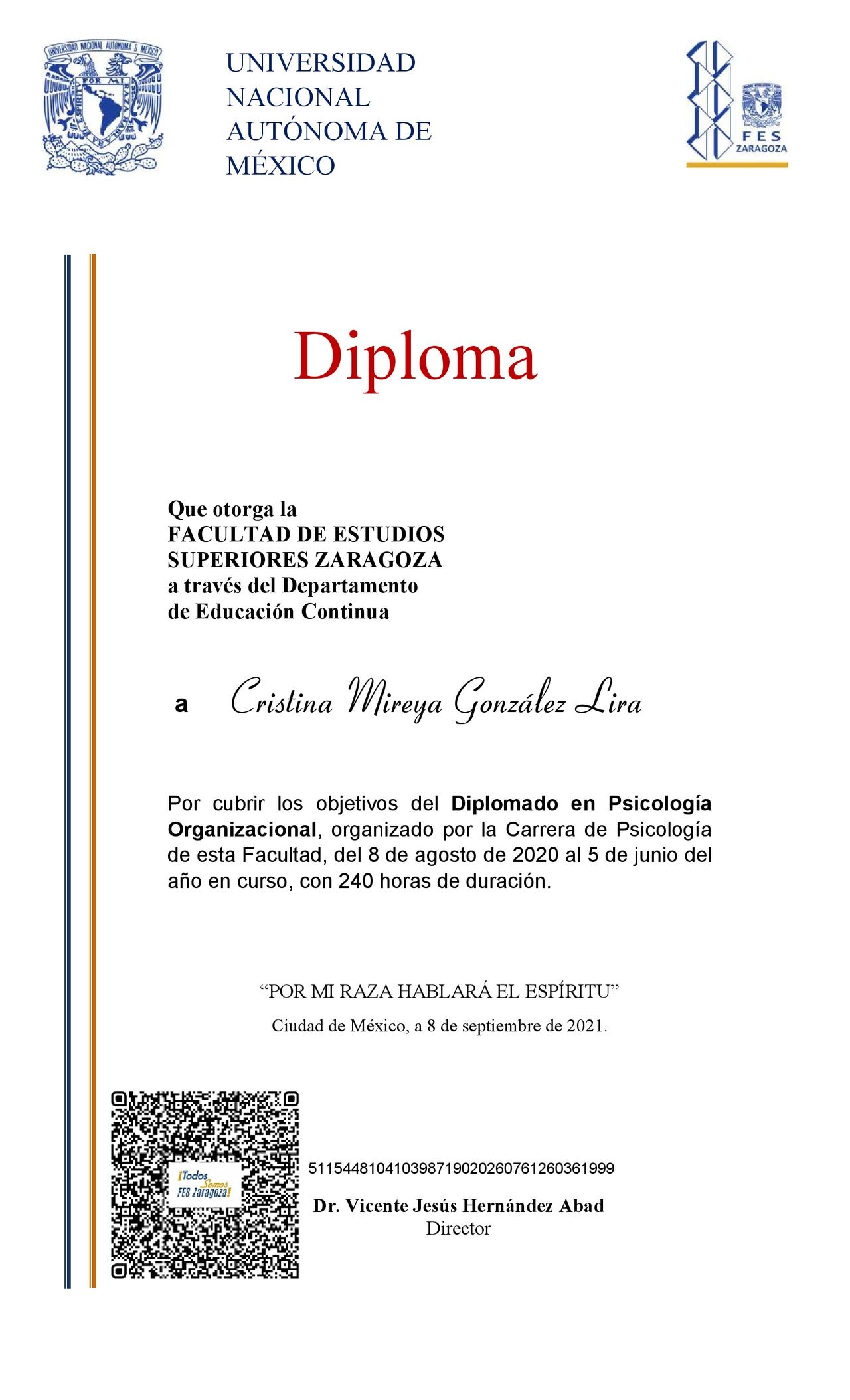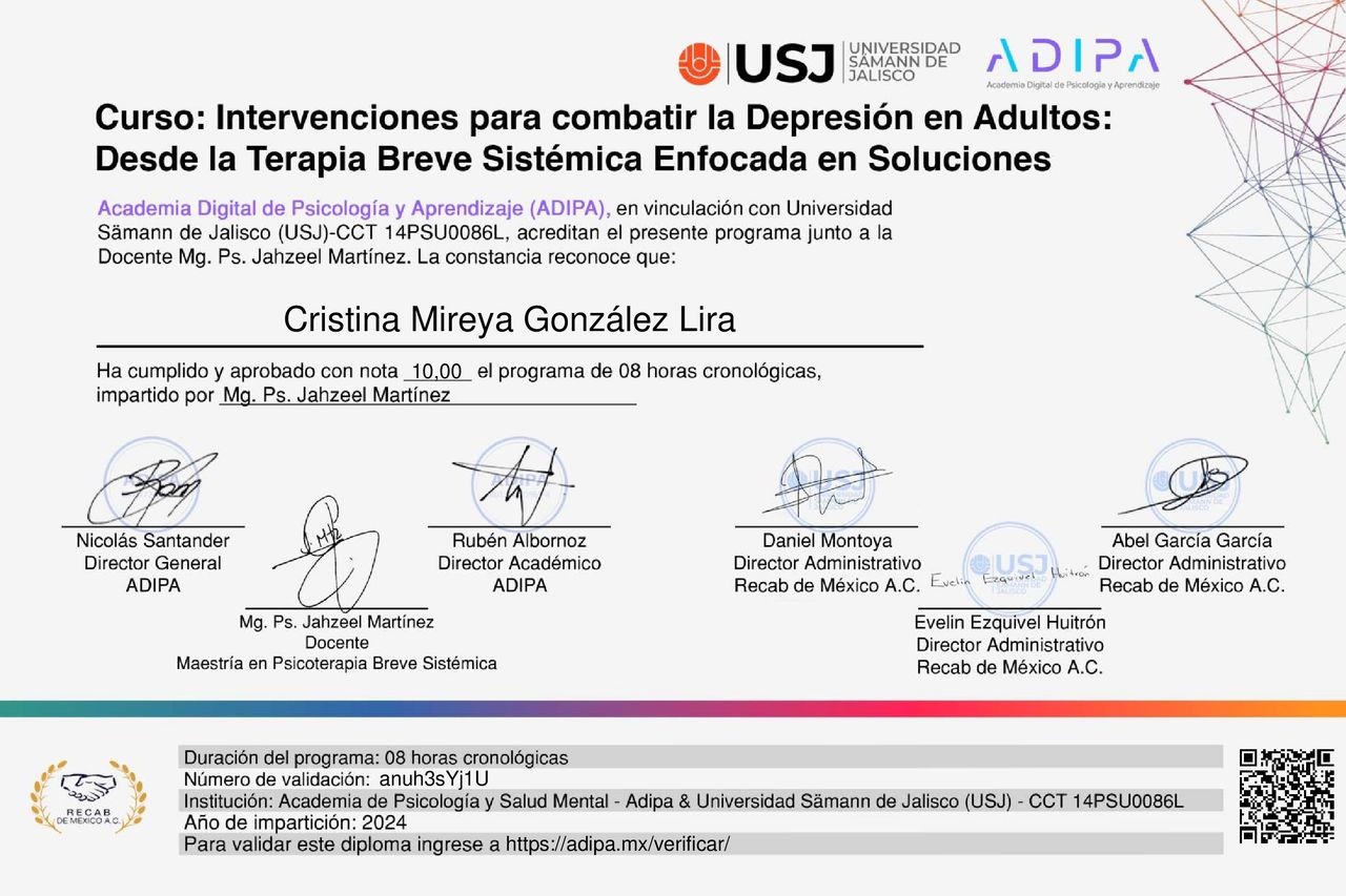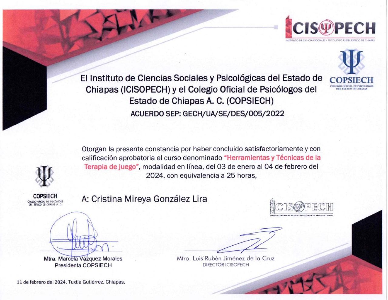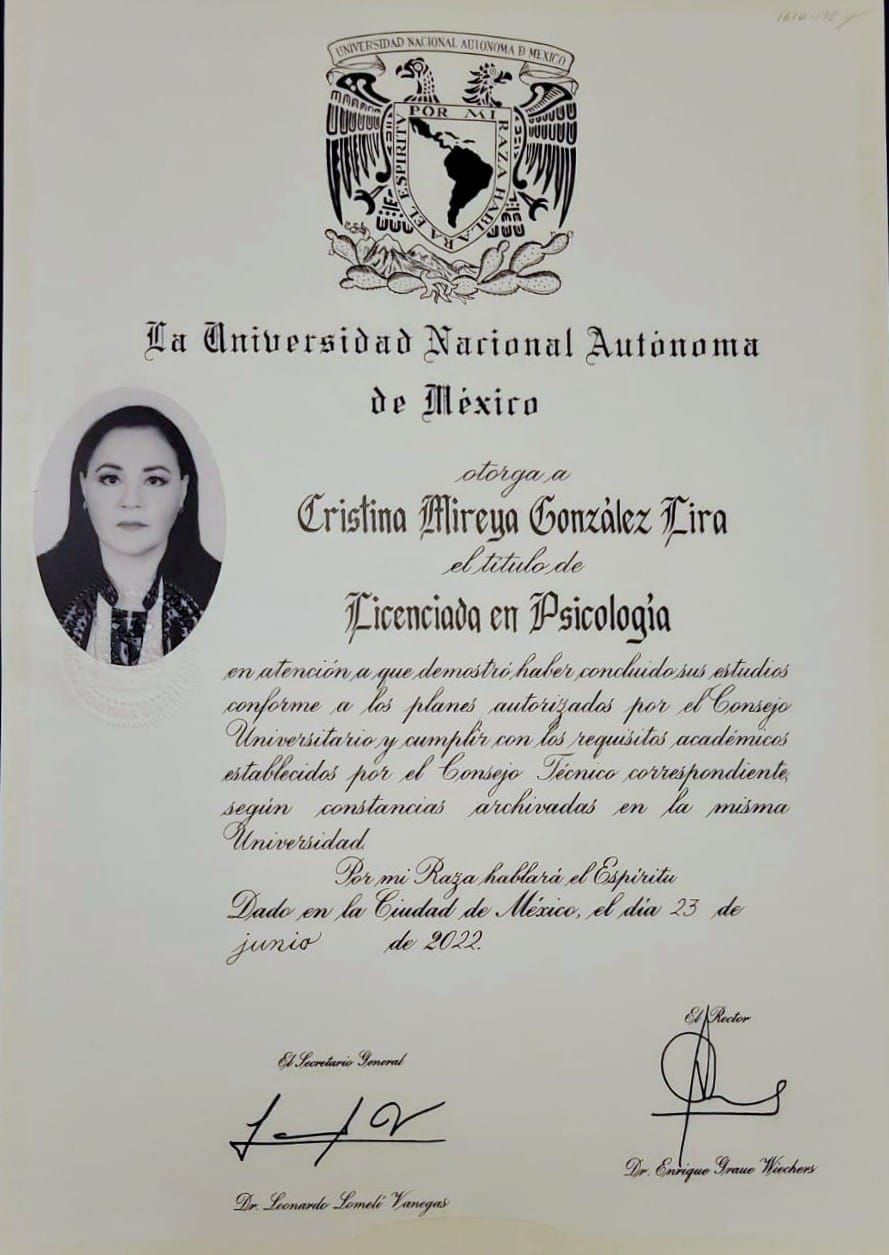 Egresada de la Universidad Nacional Autónoma de México, con 20 años de experiencia en asesoría y orientación psicológica, especialidad con posgrado en psicología clínica y salud mental, técnicas y herramientas de investigación en psicoterapia, diversas actualizaciones en terapia breve. Hipnosis clínica Ericksoniana, Psicodiagnóstico basados en el DSM5-TR Y CIE-11. Terapia del juego en los trastornos del comportamiento en niños y adolescentes, recientemente diplomado en Tanatología, duelo y acompañamiento.