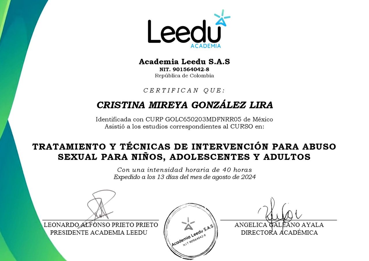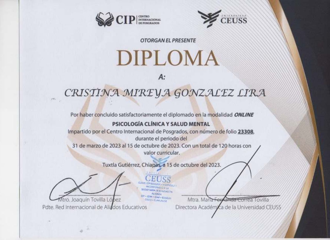 La primera consulta que tuve con la psicóloga Cristina fue para mi de gran apoyo,me gusto que la atención que me brindo fue cálida y me otorgo más tiempo para poderle contar la situación por la que atravieso eso ayuda para que el psicólogo(a) tenga una información más detallada del problema del paciente,también nos ayudo a crear una conexión con empatía y eso me genero un círculo de confianza con la psicóloga,la recomiendo como una buena psicóloga para alguien que esté buscando tomar terapia la psicóloga Cristina es la opción y yo sí quiero seguir llevando mis terapias con ella para que juntas con su atención me ayude a superar las situaciones que se me presentan espero les ayude mi comentario a quien busca mejorarse como persona y sentirse mejor consigo mismo,las personas no deben olvidar que buscar ayuda de un profesional no es malo,al contrario es querer sanar de verdad de algún momento doloroso de sus vidas y que cuando más pronto se trate es mejor siempre se puede salir adelante.