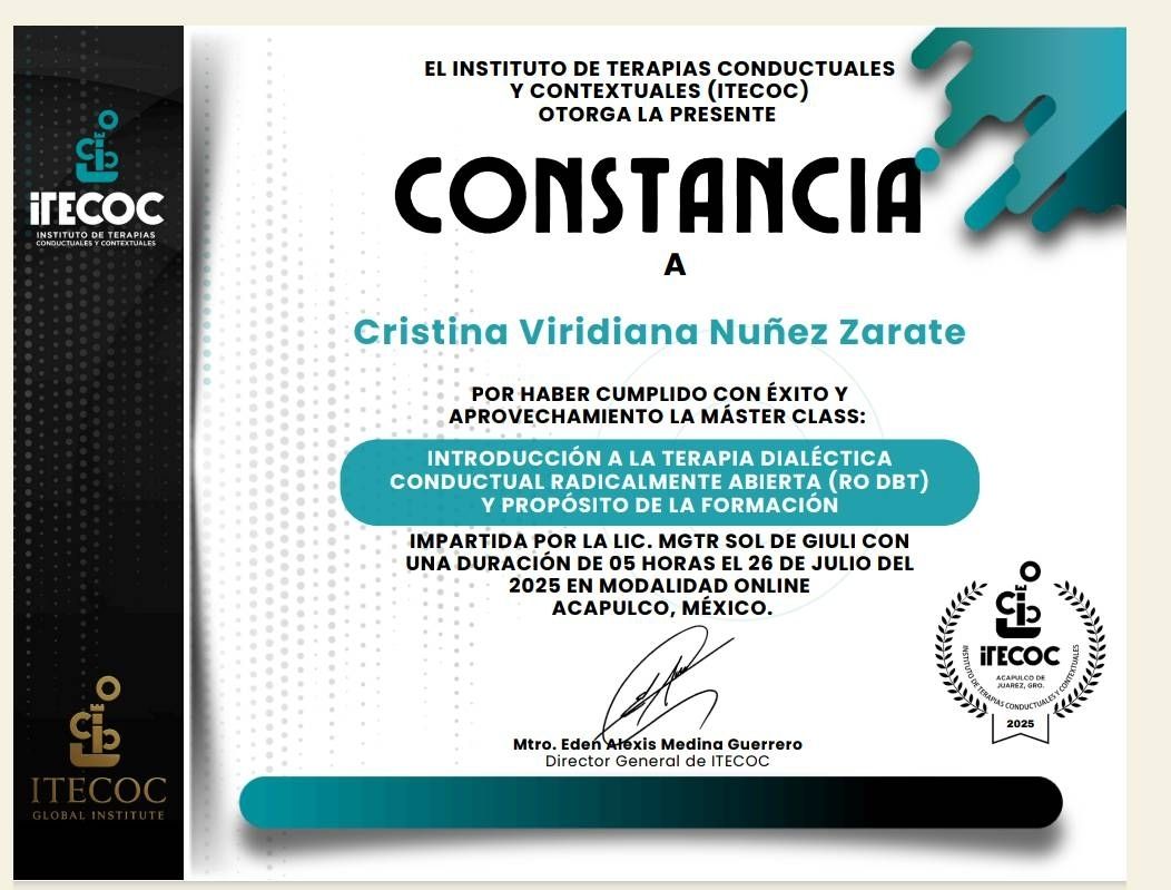 - Técnicas Efectivas. Utilizo herramientas terapéuticas desde la terapia Cognitivo Conductual, Terapia de Aceptación y Compromiso, y terapia Dialéctica Conductual; comprobadas y basadas en evidencia.