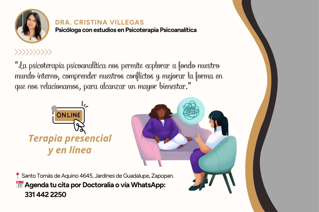 Hola mi nombre es Cristina Villegas soy doctora en psicología, con especializaciones en el ámbito clínico desde un enfoque psicoanalítico.