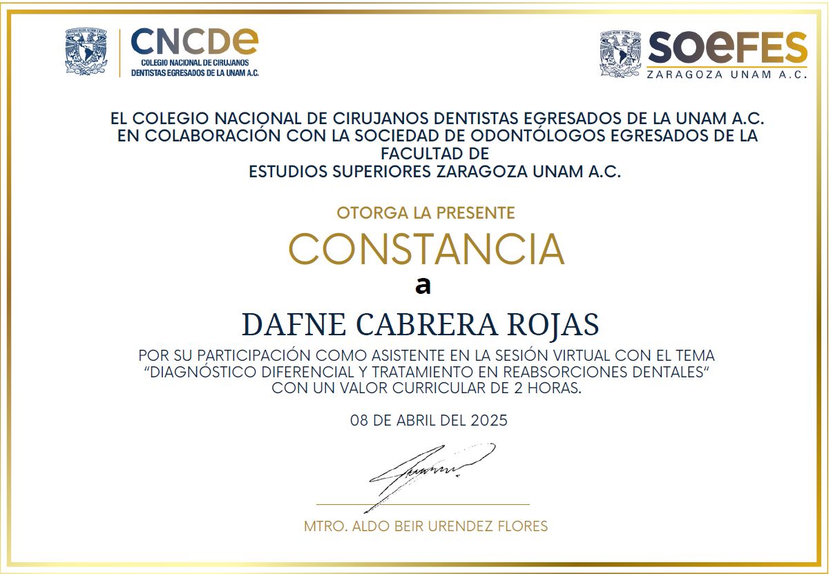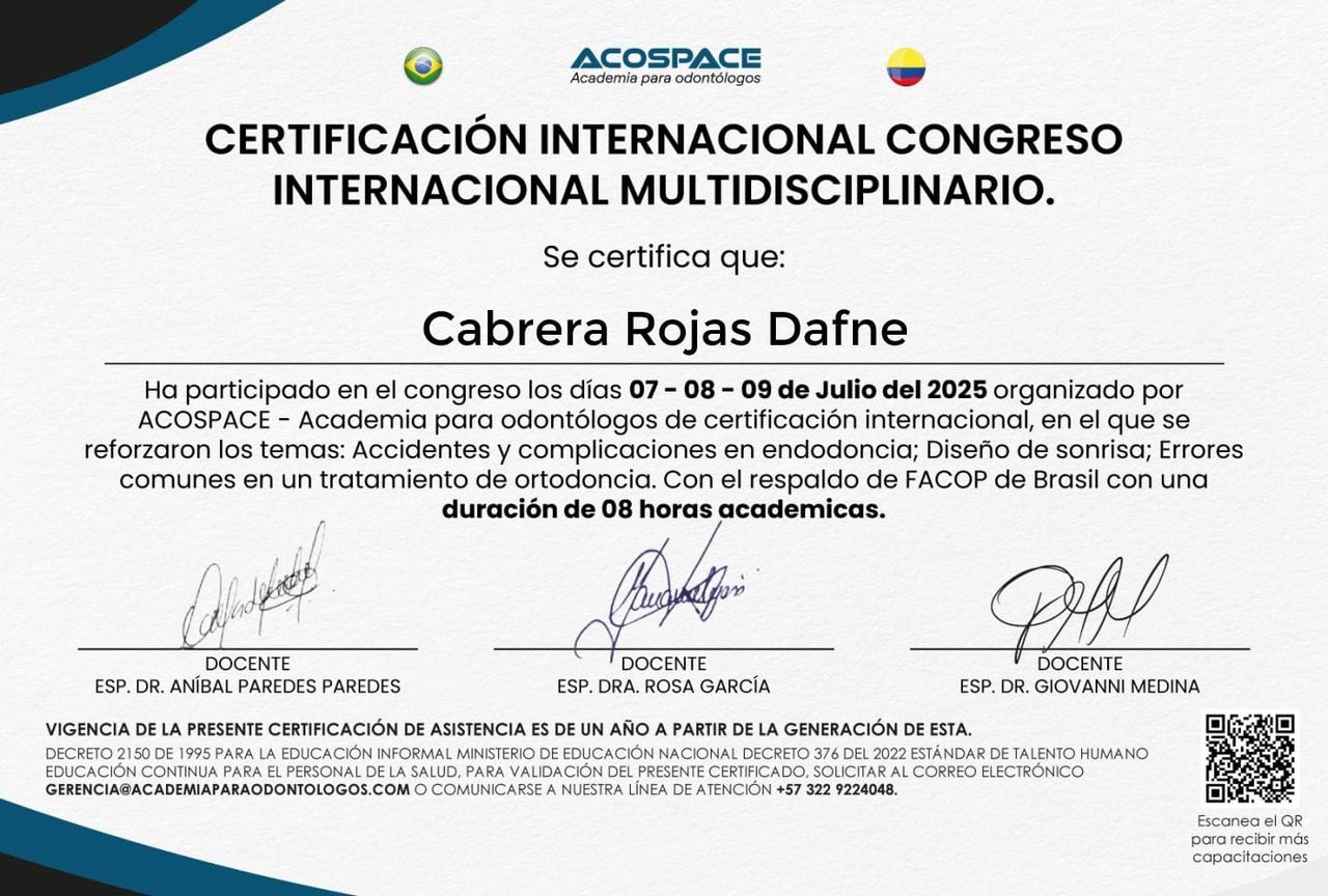 Soy Dafne Cabrera, cirujana dentista egresada de la Facultad de Odontología de la Universidad Nacional Autónoma de México. Tengo, junto con mi equipo, el objetivo de brindar servicios odontológicos integrales para ti y tu familia con calidad y ética; para que juntos tratemos los aspectos clínicos necesarios en pro de tu salud, considerando tus necesidades y expectativas individuales en el servicio. Contamos con la tecnología y la sólida formación académica para asegurarte procedimientos eficaces y cómodos, siempre con el propósito firme de tu bienestar y el de tus seres queridos. Estoy aquí para ayudarte, si tienes dudas emergentes puedes enviarme mensaje. ¡Espero podamos conocernos pronto!