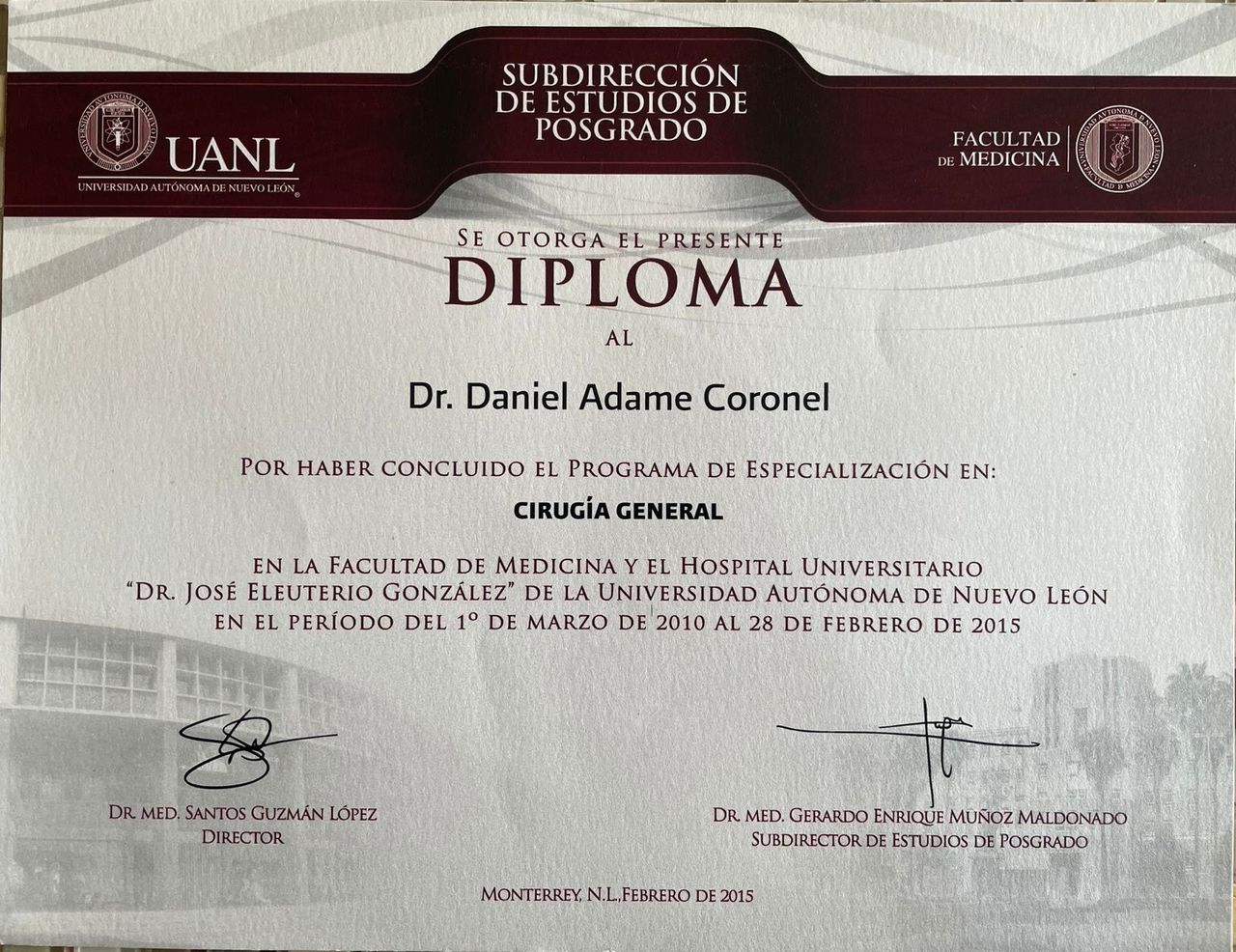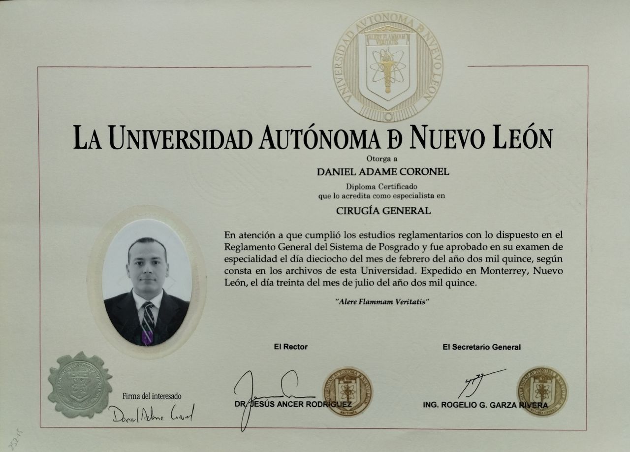 Soy especialista en Cirugía General, con 10 años de experiencia en la atención pública y privada, graduado de la Universidad Autónoma de Nuevo León.