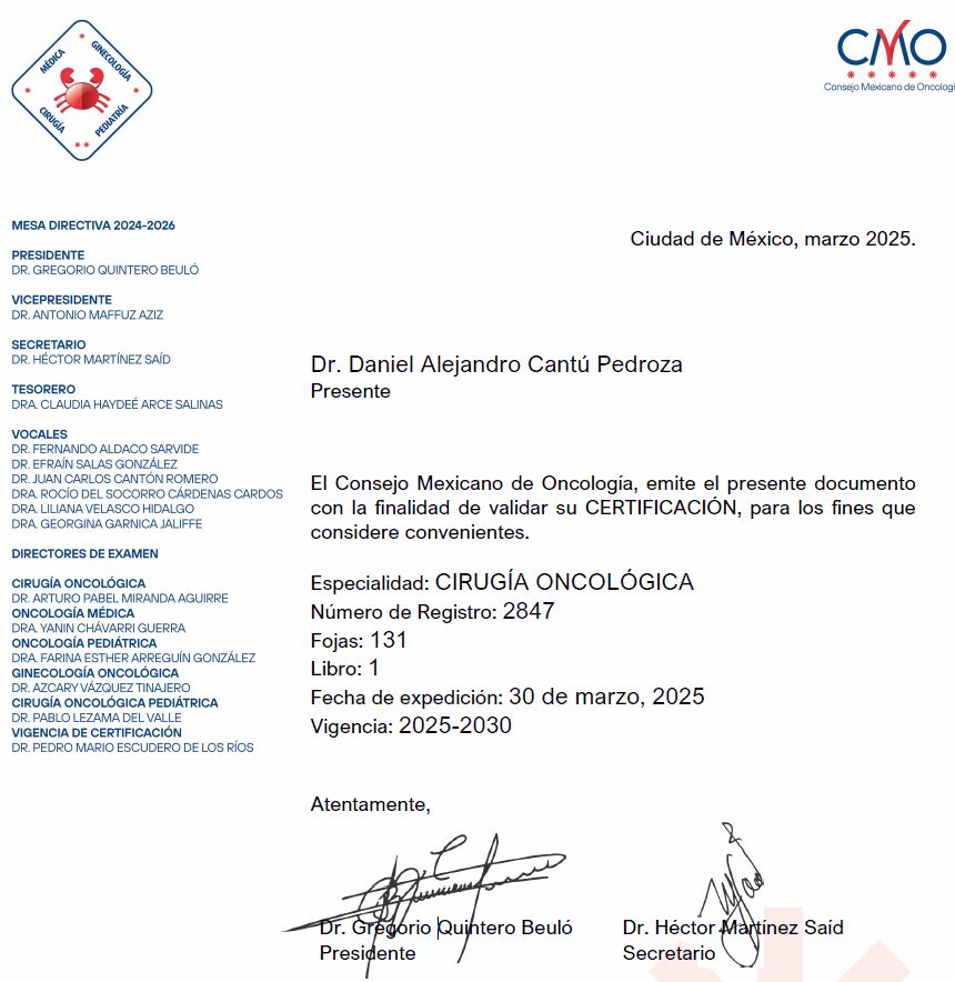 Sub especialista en oncología quirúrgica en la Unidad Médica de Alta Especialidad Centro Medico Nacional del Bajío en León, Gto. Con certificación por el Consejo Mexicano de Oncología. Miembro de la Sociedad Mexicana de Oncología y la Sociedad Latinoamericana y del Caribe de Oncología Médica (SLACOM).