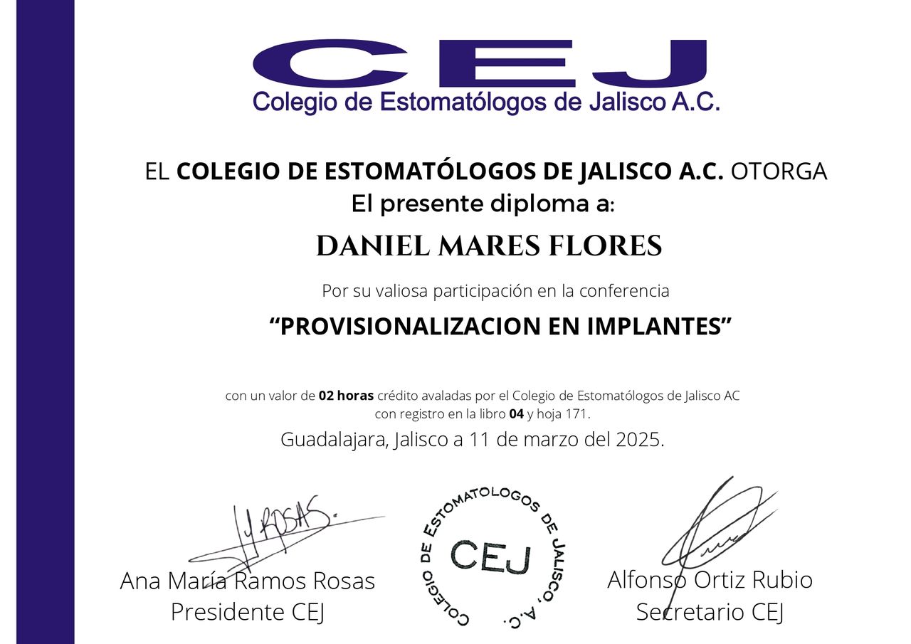 Soy cirujano dentista con diplomado en Ortodoncia e Implantología, y en actualización constante. Pertenezco al Colegio de Estomatólogos de Jalisco (CEJ) como miembro activo de la mesa directiva. Apasionado por ofrecer tratamientos de alta calidad que mejoren la salud bucal y la estética de mis pacientes. Mi enfoque combina tecnología de vanguardia, atención personalizada y un trato humano para lograr resultados funcionales y estéticos, siempre priorizando el bienestar y la seguridad de cada persona.