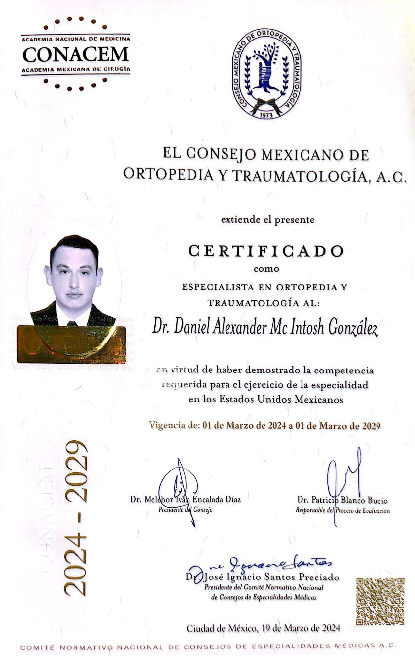 El Dr. McIntosh es un ortopedista altamente especializado en cirugía articular y deportiva, con amplia experiencia en el diagnóstico, tratamiento y rehabilitación de lesiones musculoesqueléticas relacionadas con el deporte. Con un enfoque humano y profesional, se dedica a garantizar la salud y el bienestar de sus pacientes, permitiéndoles regresar a sus actividades cotidianas y deportivas con seguridad y confianza. Áreas de especialización: Cirugía articular mínimamente invasiva, Tratamiento de lesiones deportivas (lesiones de ligamentos, tendones, cartílago) Artroscopia de rodilla y hombro, Manejo de enfermedades articulares degenerativas, Rehabilitación y prevención de lesiones deportivas Manejo conservador y quirúrgico de fracturas