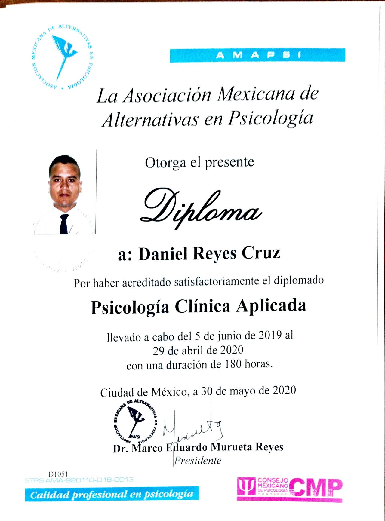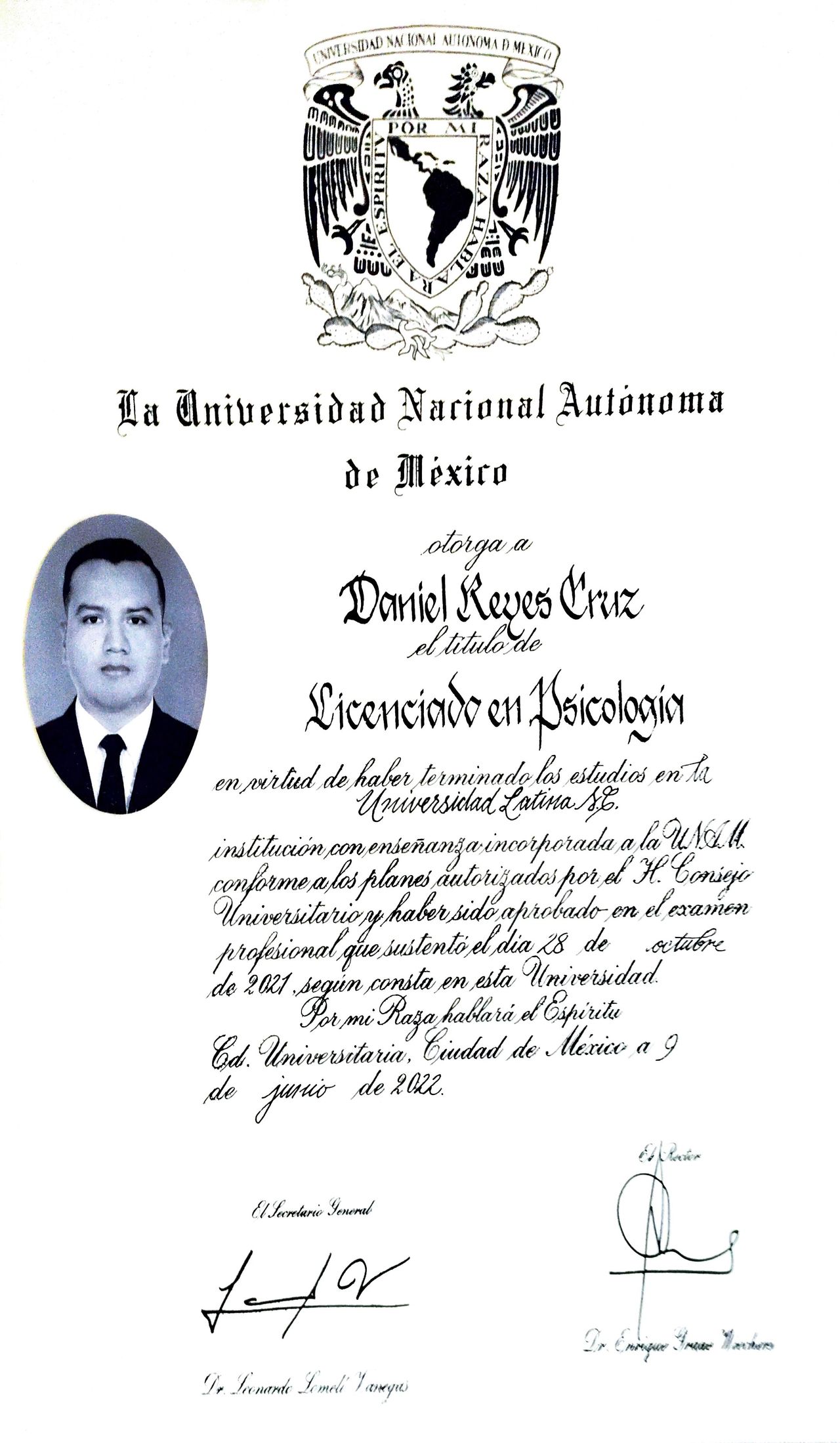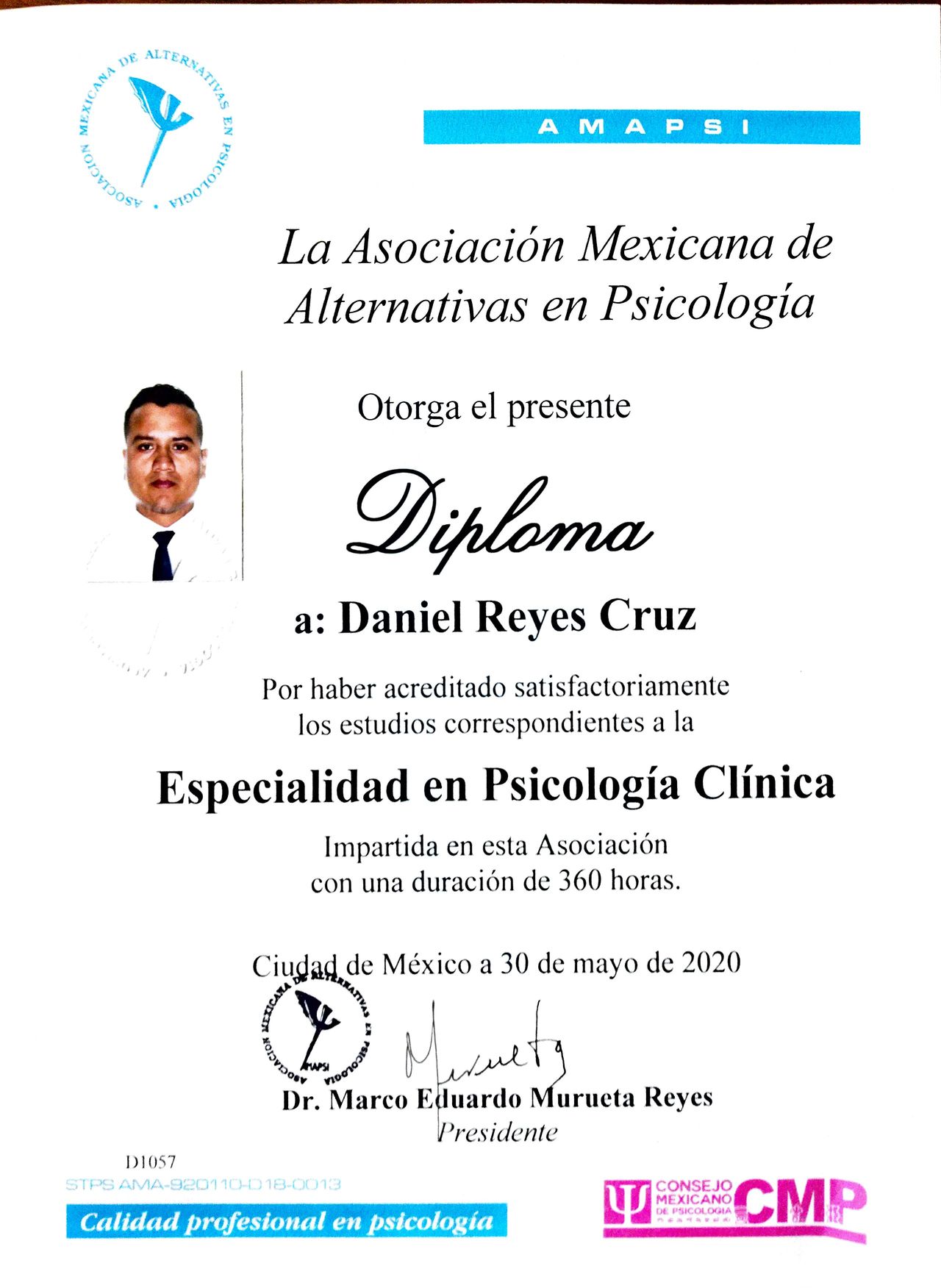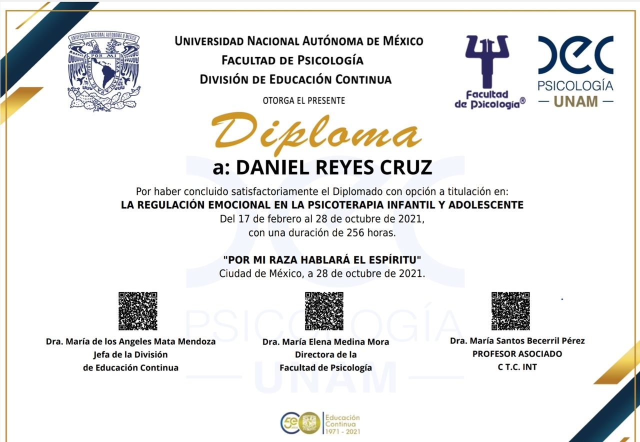 Yo soy Daniel Reyes Cruz, estudié psicología, título y cédula UNAM. Cursé la especialidad de psicología clínica en AMAPSI, también el Diplomado en "Regulación emocional en la psicoterapia infantil y del adolescente" impartido por la UNAM.