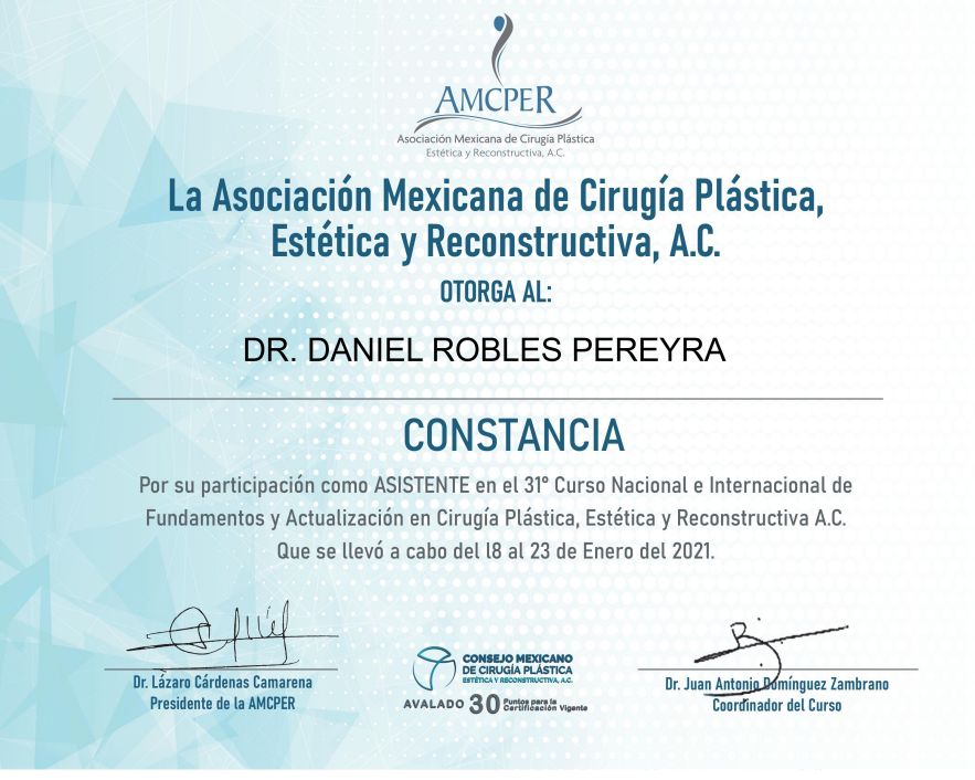 Cuento con más de 20 años de experiencia, certificación por el Consejo Mexicano de Cirugía Plástica y pertenezco a asociaciones nacionales e internacionales que me permiten mantenerme actualizado en las técnicas más modernas y seguras. Opero únicamente en hospitales certificados, priorizando siempre tu seguridad.