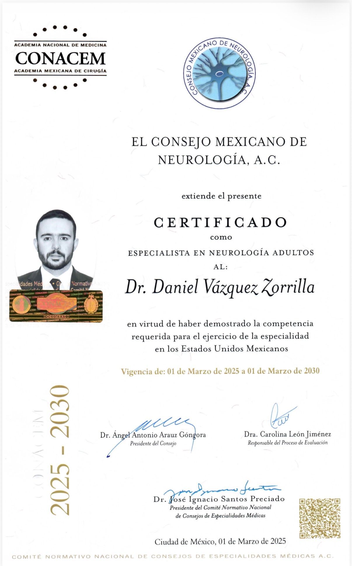 Cuento con certificación vigente por el Consejo Mexicano de Neurología para el periodo 2025–2030.